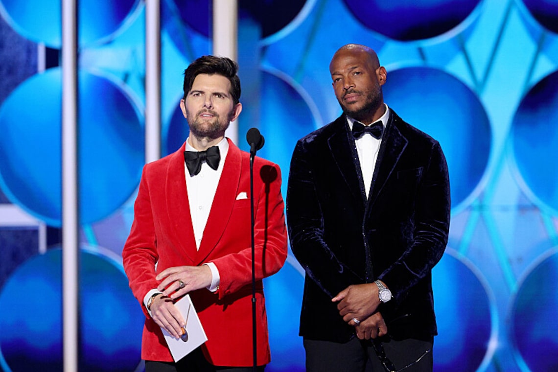 Adam Scott e Marlon Wayans falam no palco durante a 83ª edição do Globo de Ouro.