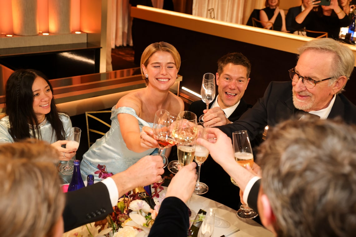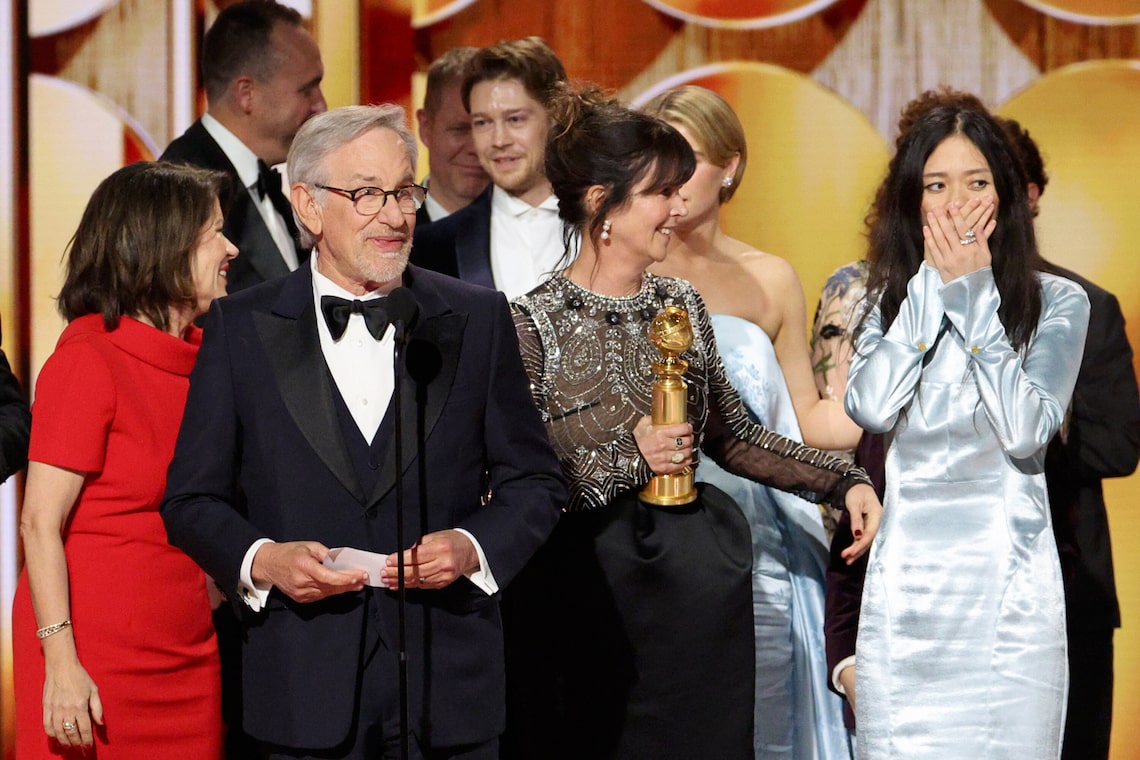 Pippa Harris, Nicolas Gonda, Steven Spielberg, Joe Alwyn, Joe Alwyn, Liza Marshall, Jessie Buckley e Chloé Zhao aceitam o prêmio de Melhor Filme —Drama por “Hamnet” no palco durante a 83ª edição anual do Globo de Ouro.