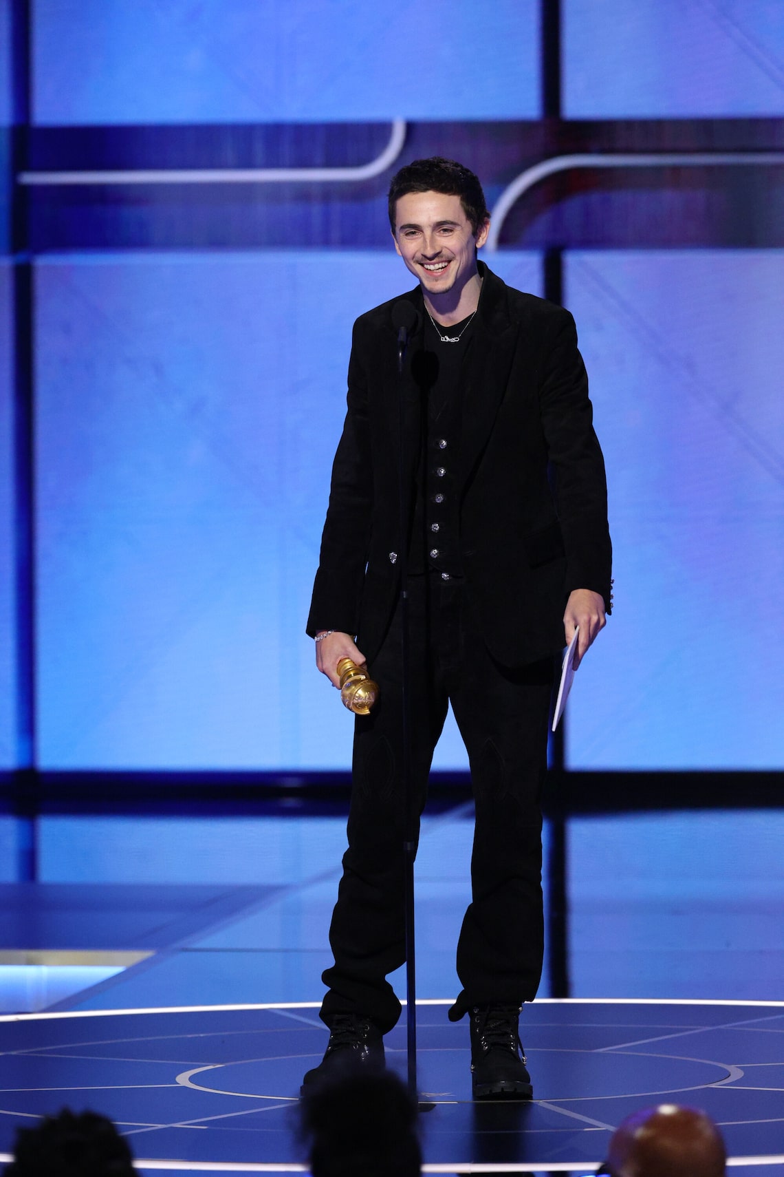 Timothée Chalamet recebe o prêmio de Melhor Ator em Filme – Musical ou Comédia por “Marty Supreme” no palco durante a 83ª edição anual do Globo de Ouro.