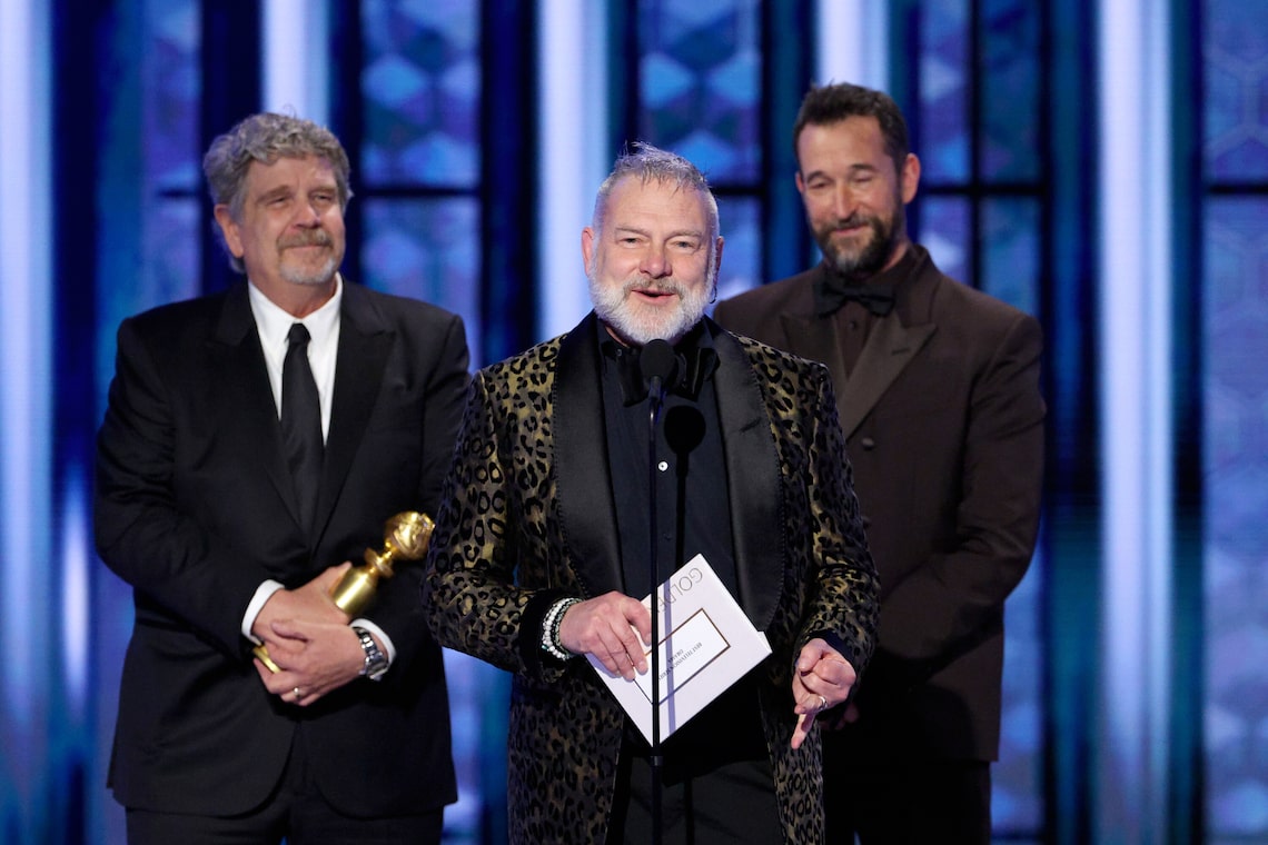 John Wells, R. Scott Gemmill e Noah Wyle recebem o prêmio de Melhor Série de TV – Drama por “The Pitt” no palco durante a 83ª edição anual do Globo de Ouro.