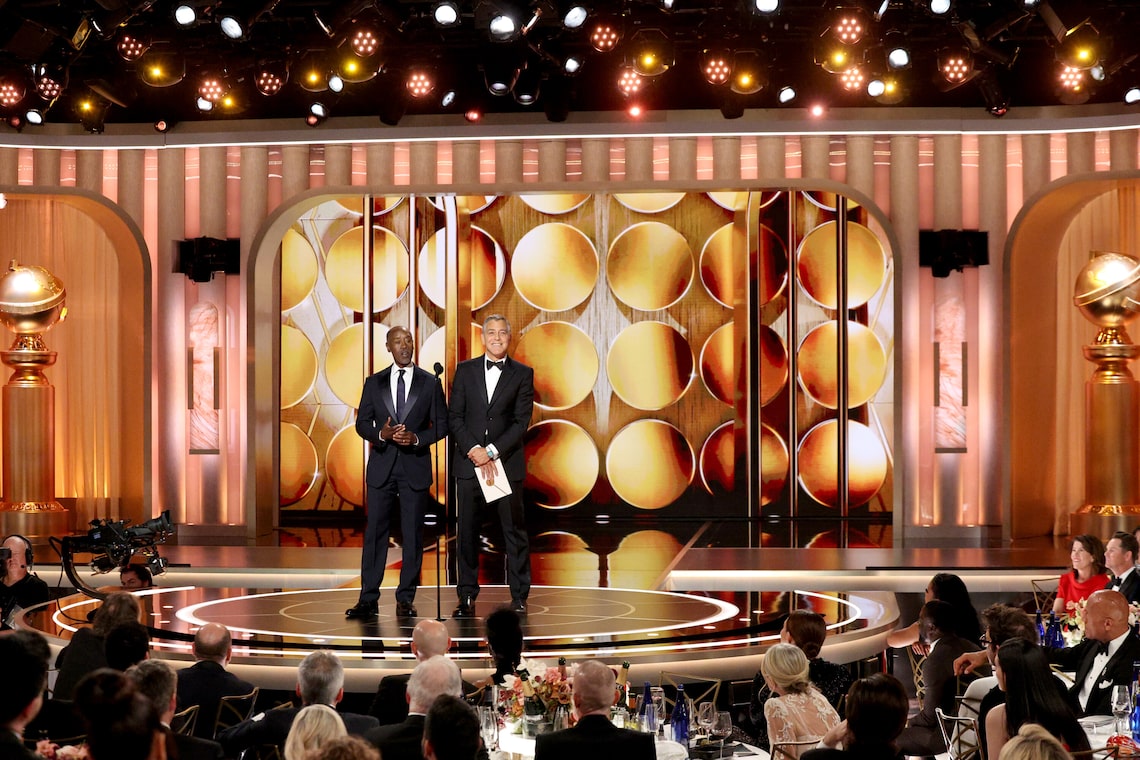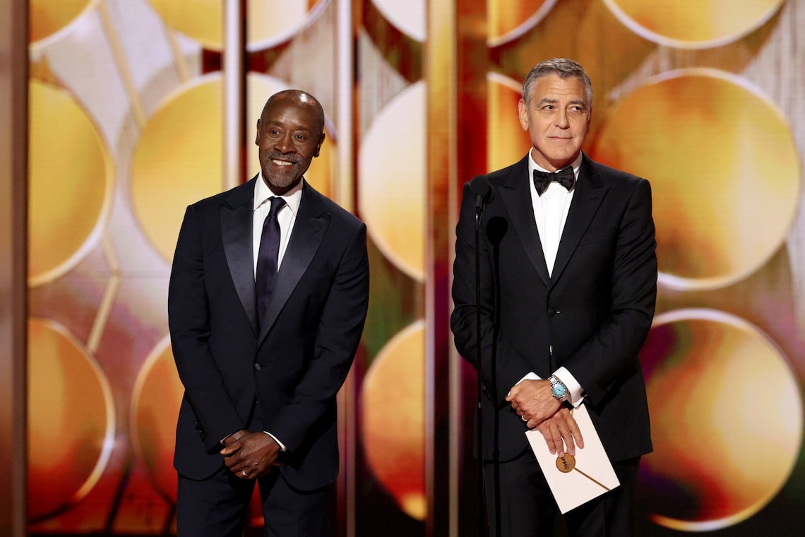 Don Cheadle e George Clooney falam no palco durante a 83ª edição do Globo de Ouro.