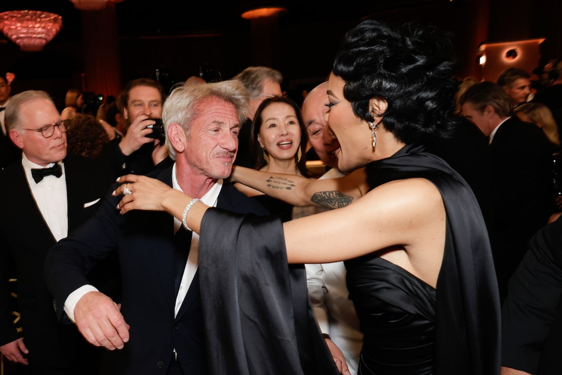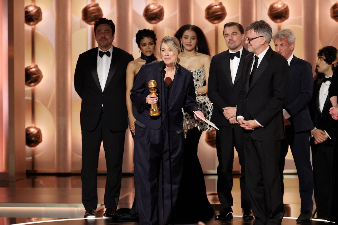 Benicio del Toro, Teyana Taylor, Sara Murphy, Chase Infiniti, Leonardo DiCaprio, Paul Thomas Anderson e Sean Penn recebem o prêmio de Melhor Filme – Musical ou Comédia por “One Battle After Another” no palco durante a 83ª edição anual do Globo de Ouro.