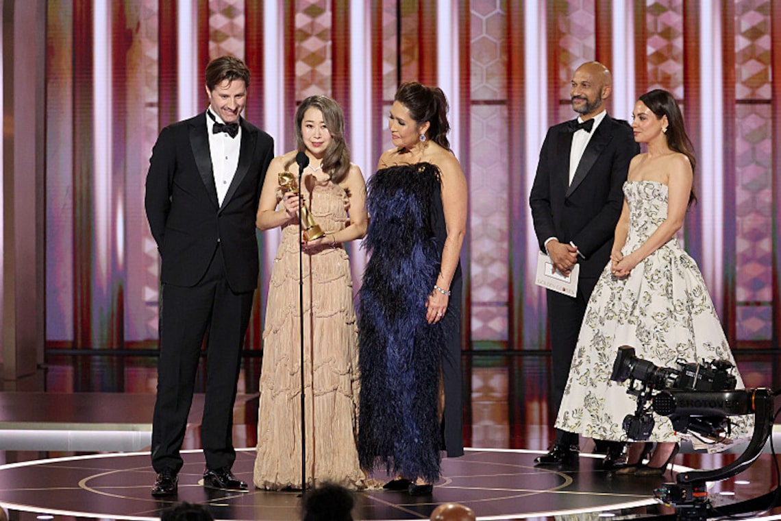 James Weaver, Chase Sui Wonders, Seth Rogen e Alex Gregory recebem o prêmio de Melhor Série de TV – Musical ou Comédia por “The Sudio” no palco durante a 83ª edição anual do Globo de Ouro.
