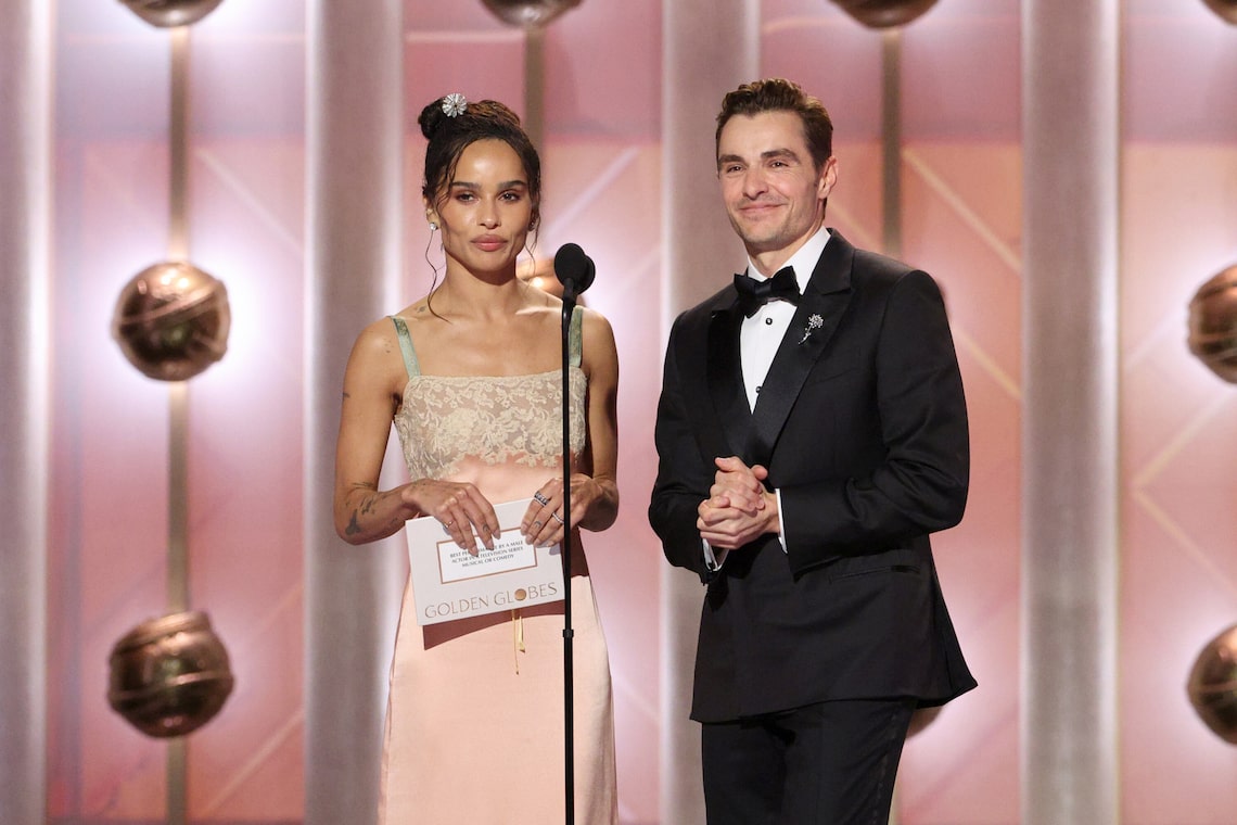 Zoë Kravitz e Dave Franco falam no palco durante a 83ª edição do Globo de Ouro Anual.