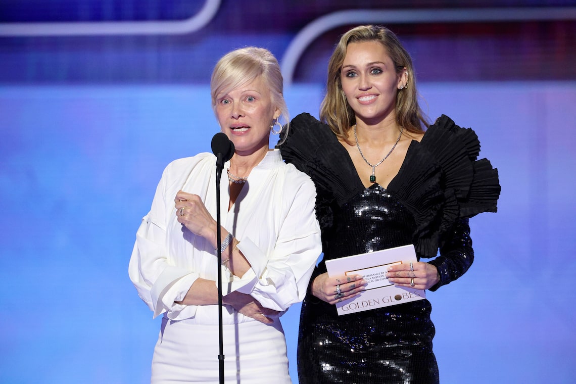 Pamela Anderson e Miley Cyrus falam no palco durante a 83ª edição do Golden Globe Awards.