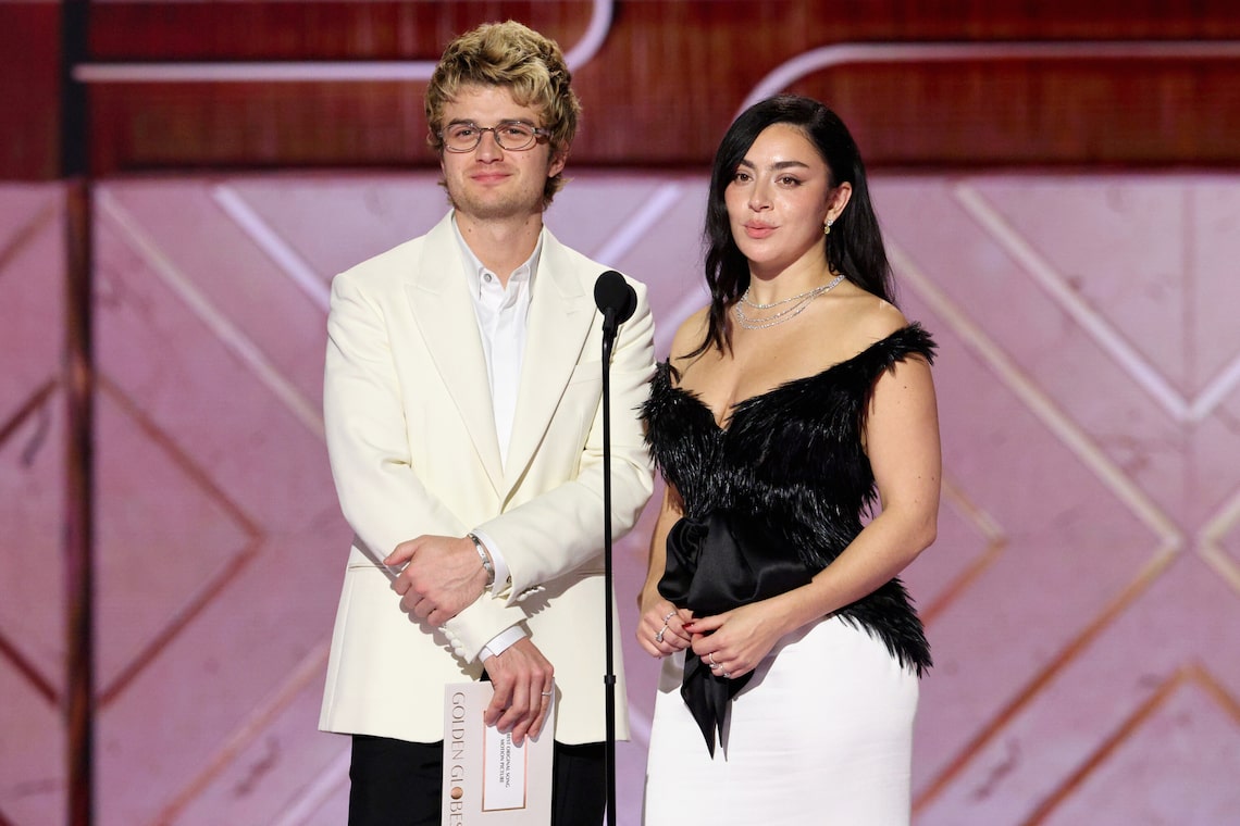 Joe Keery e Charli XCX falam no palco durante a 83ª edição do Globo de Ouro Anual.