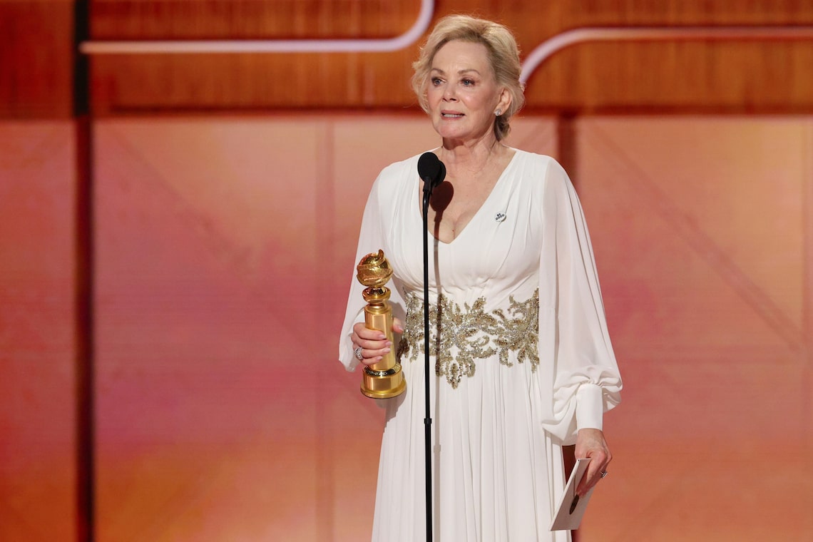Jean Smart recebe o prêmio de Melhor Performance de Atriz Principal em Série de TV – Musical ou Comédia por “Hacks” no palco durante a 83ª edição anual do Globo de Ouro.