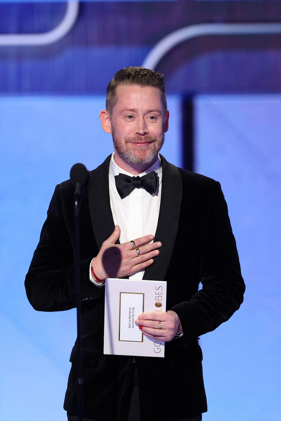 Macaulay Culkin fala no palco durante a 83ª edição do Globo de Ouro.