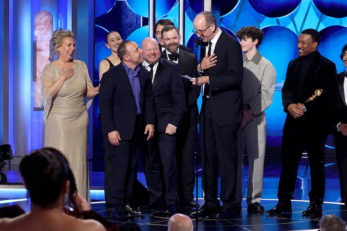 Hannah Walters, Erin Doherty, Stephen Graham, Mark Herbert, Philip Barantini, Jack Thorne, Owen Cooper e Ashley Walters recebem o prêmio de Melhor Série Limitada, Série de Antologia ou Filme Feito para Televisão por “Adolescência” no palco durante a 83ª edição anual do Globo de Ouro.