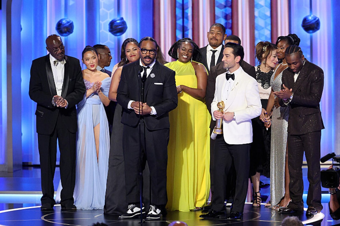 Delroy Lindo, Li Jun Li, Zinzi Coogler, Hailee Steinfeld, Ryan Coogler, Wunmi Mosaku, Omar Benson Miller, Sev Ohanian e Francine Maisle aceitam o prêmio Cinematic and Box Office Achievement Award por “Sinners” no palco durante a 83ª edição anual do Globo de Ouro.