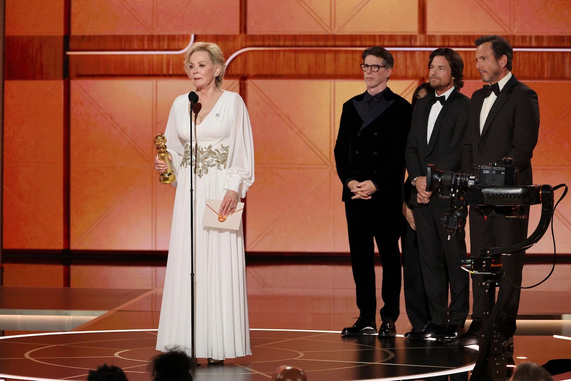Jean Smart recebe o prêmio de Melhor Performance de Atriz Principal em Série de TV – Musical ou Comédia por “Hacks” de Sean Hayes, Jason Bateman e Will Arnett no palco durante a 83ª edição anual do Globo de Ouro.