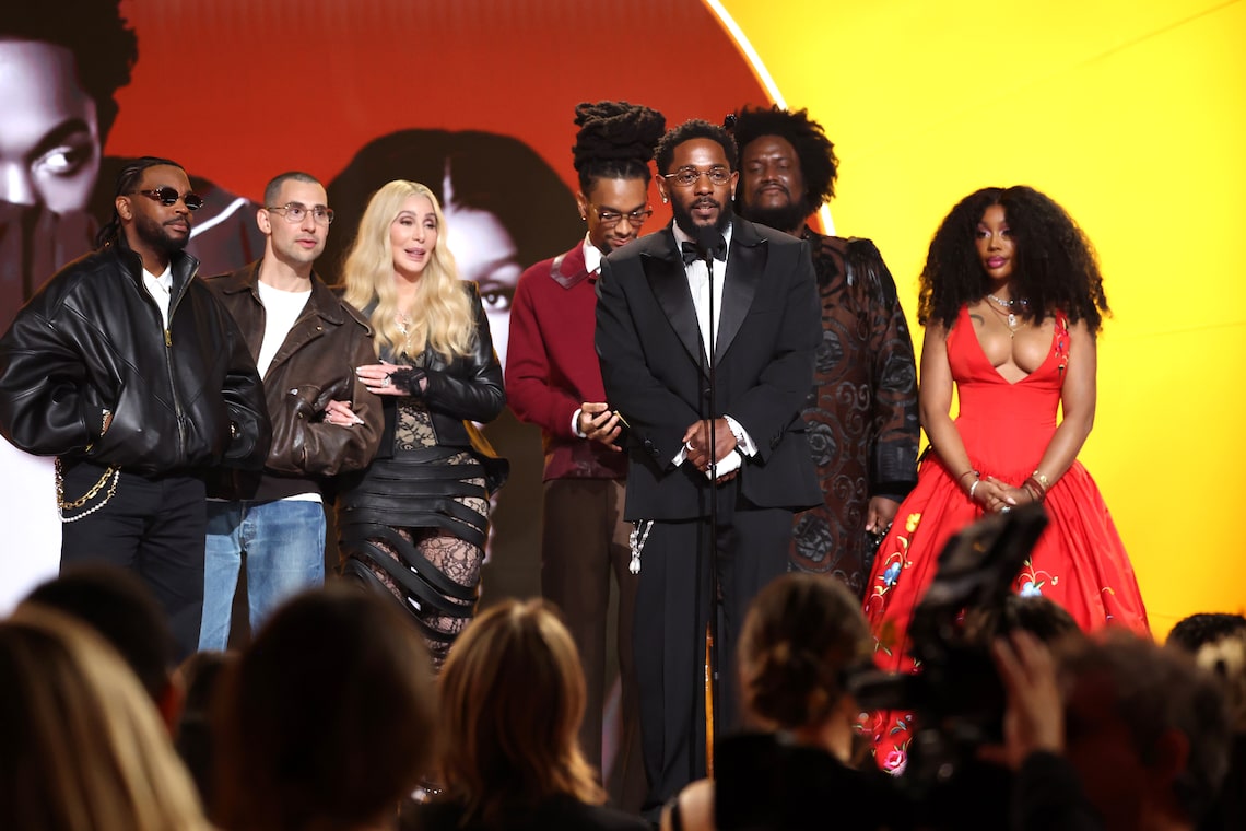 Cher entrega o prêmio de Gravação do Ano por “luther” para Sounwave, Jack Antonoff, Scott Bridgeway, Kendrick Lamar, Kamasi Washington e SZA no palco durante a 68ª edição do GRAMMY Awards.