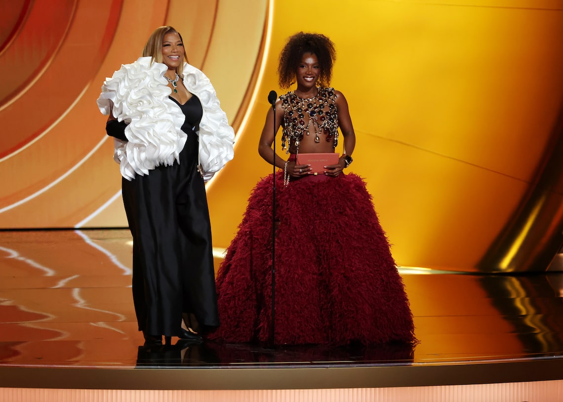 Queen Latifah e Doechii discursam no palco durante a 68ª edição do GRAMMY Awards.