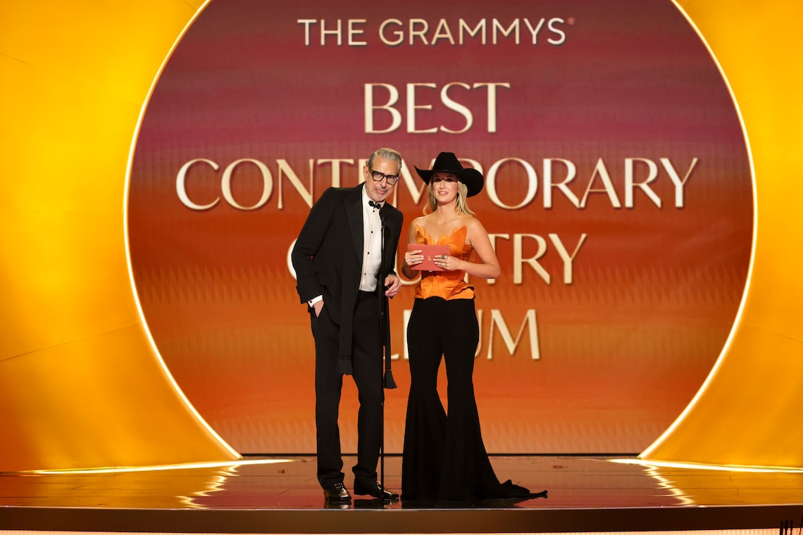 Jeff Goldblum e Lainey Wilson apresentam o prêmio de Melhor Álbum de Música Country Contemporânea na 68ª edição do Grammy Awards.