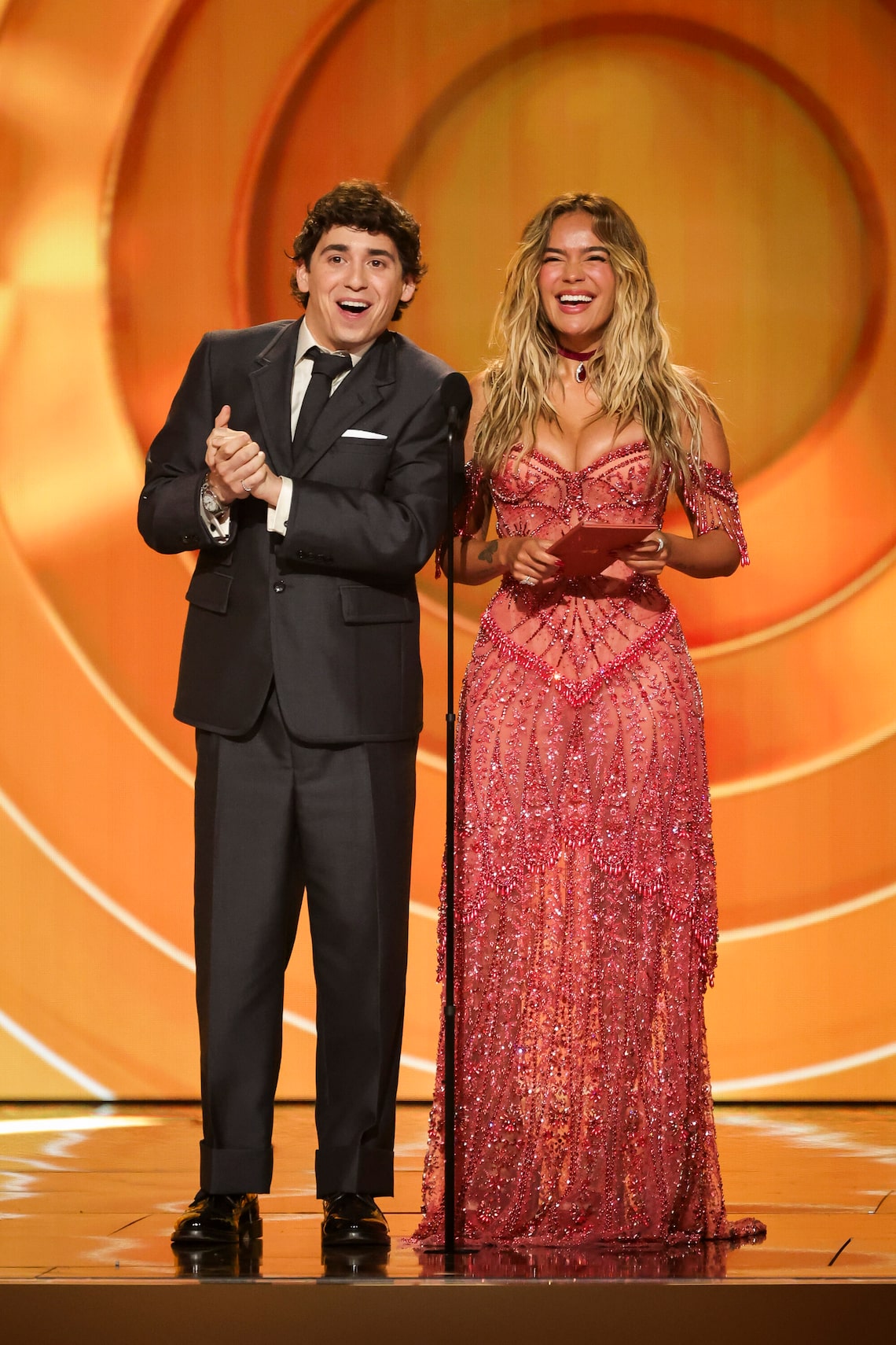 Marcello Hernández e Karol G entregam o prêmio de Melhor Álbum de Música Urbana na 68ª edição do GRAMMY Awards.