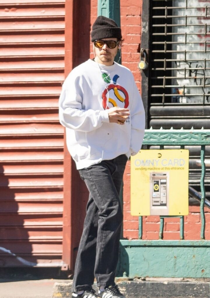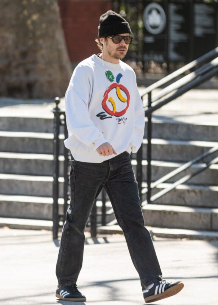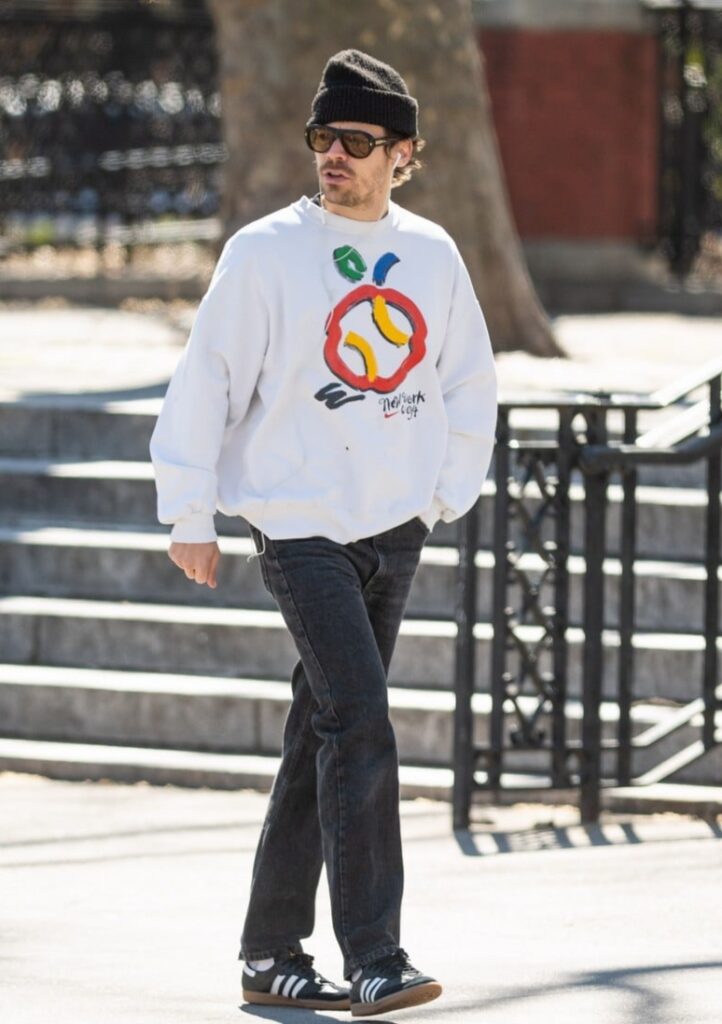 For his outing, Harry wore a casual street-style look that included a a white sweatshirt with a New York ’94 graphic on it along with dark-washed jeans, a black beanie, and aviator-style sunglasses. He finished off his look with Adidas sneakers.