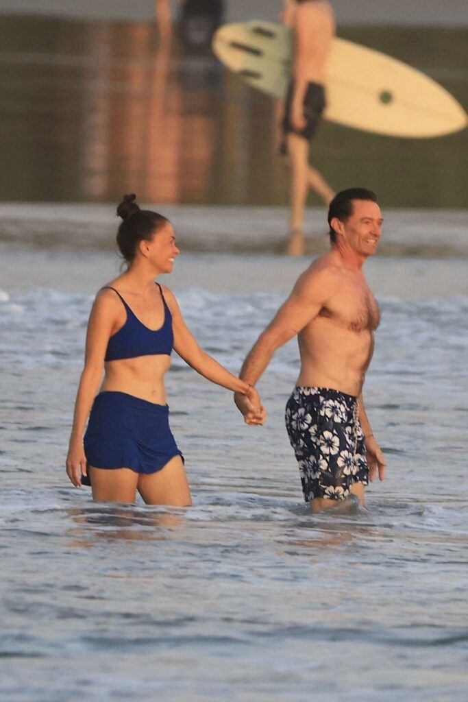 Os dois pareciam completamente apaixonados enquanto Sutton entrava nas ondas usando um biquíni azul e Hugh apreciava a paisagem com uma sunga florida.