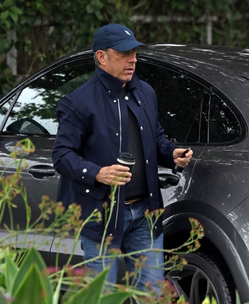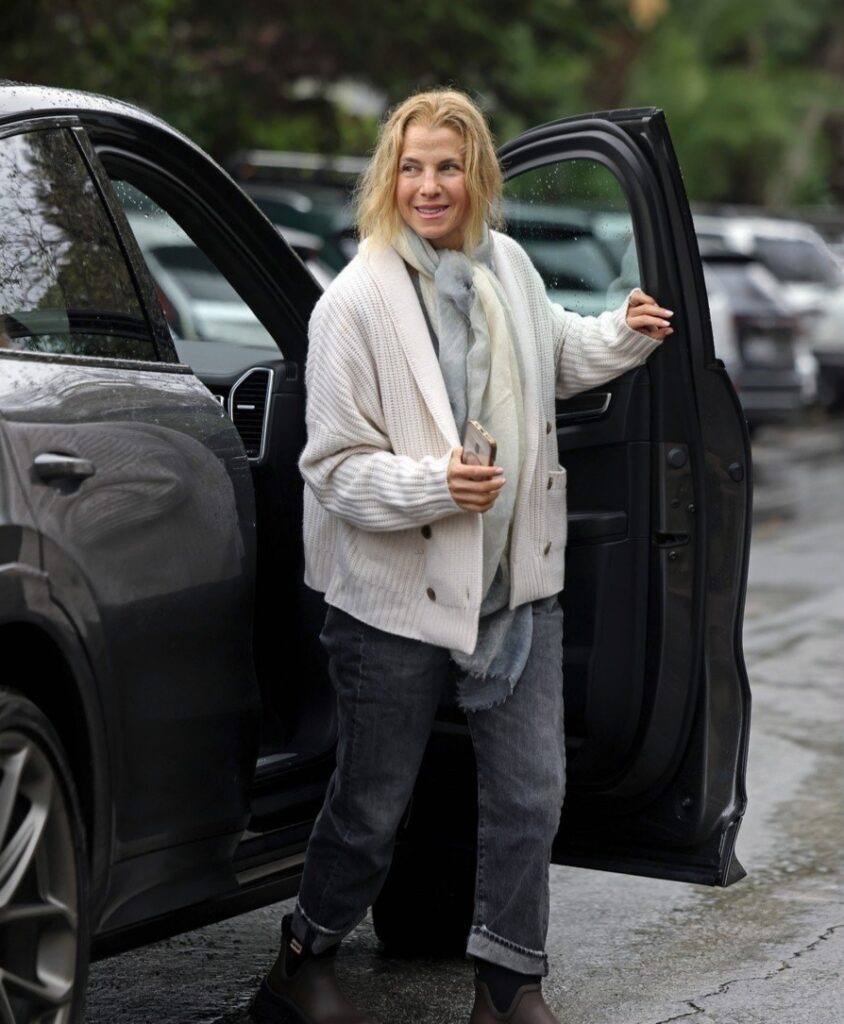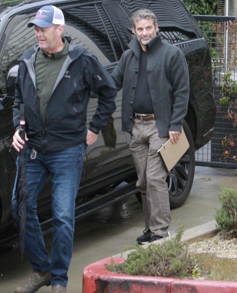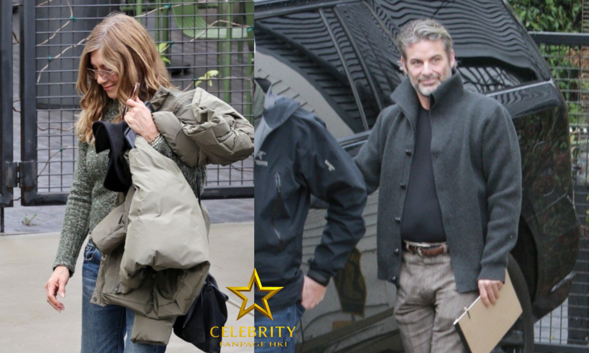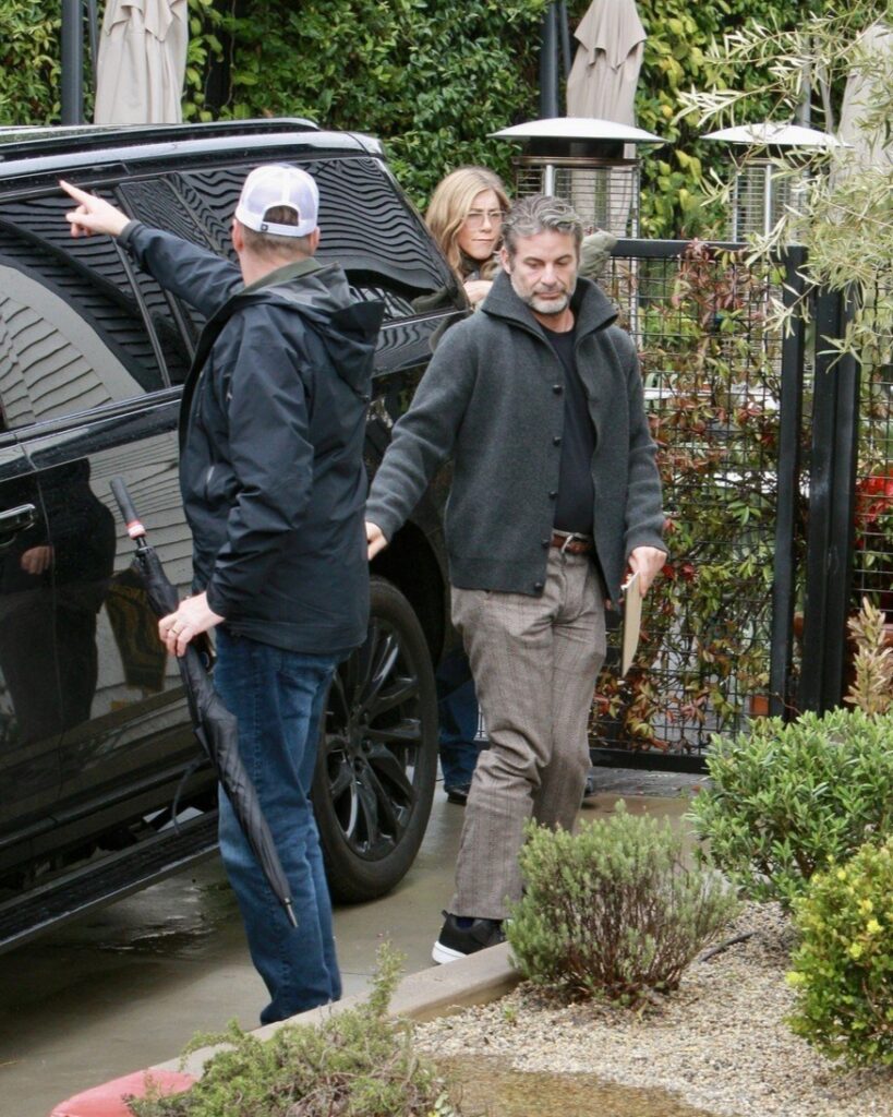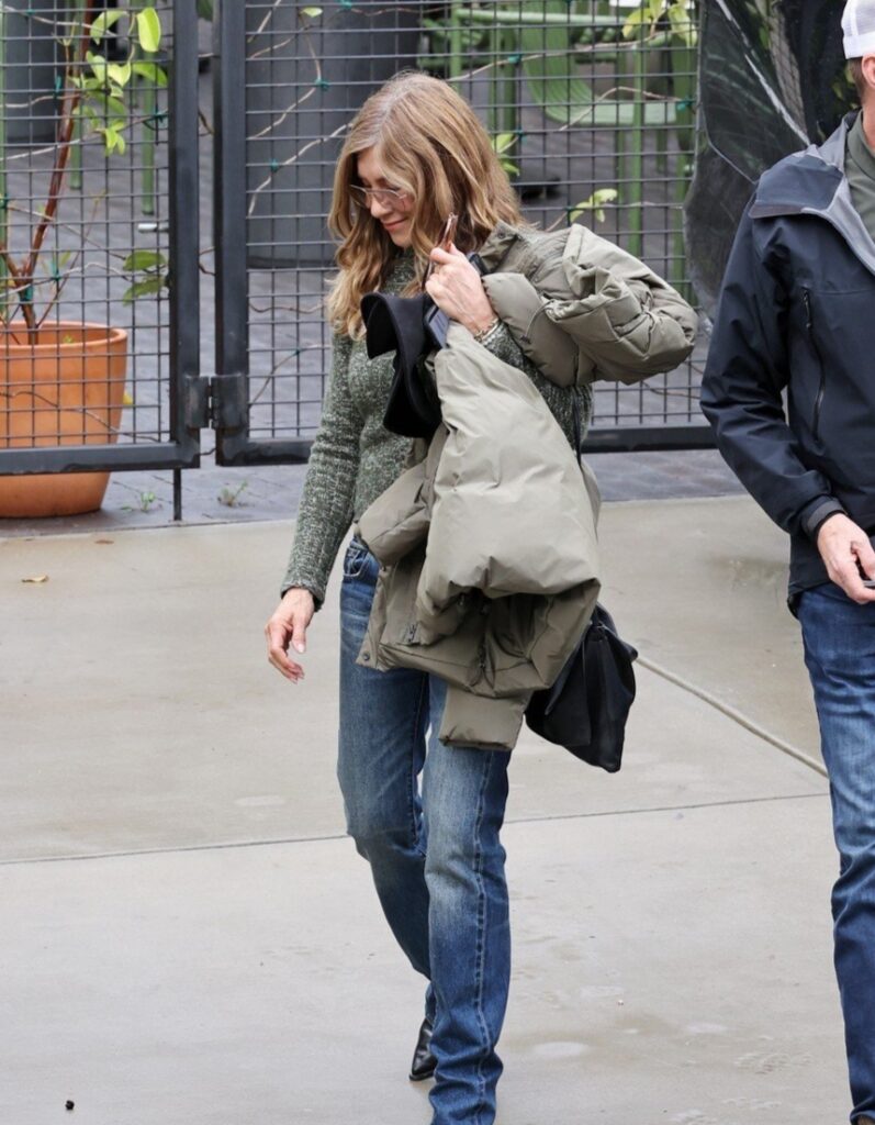 Para a ocasião, Jennifer optou por um look casual com jeans e um suéter cinza aconchegante, enquanto Jim usava calças listradas com um cardigã cinza sobre uma camiseta preta.