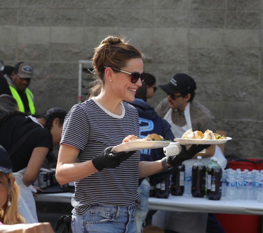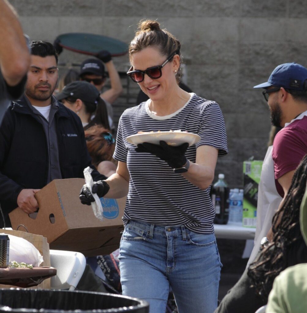 Jennifer Garner ajuda a alimentar moradores de rua em Los Angeles no Dia de Ação de Graças.