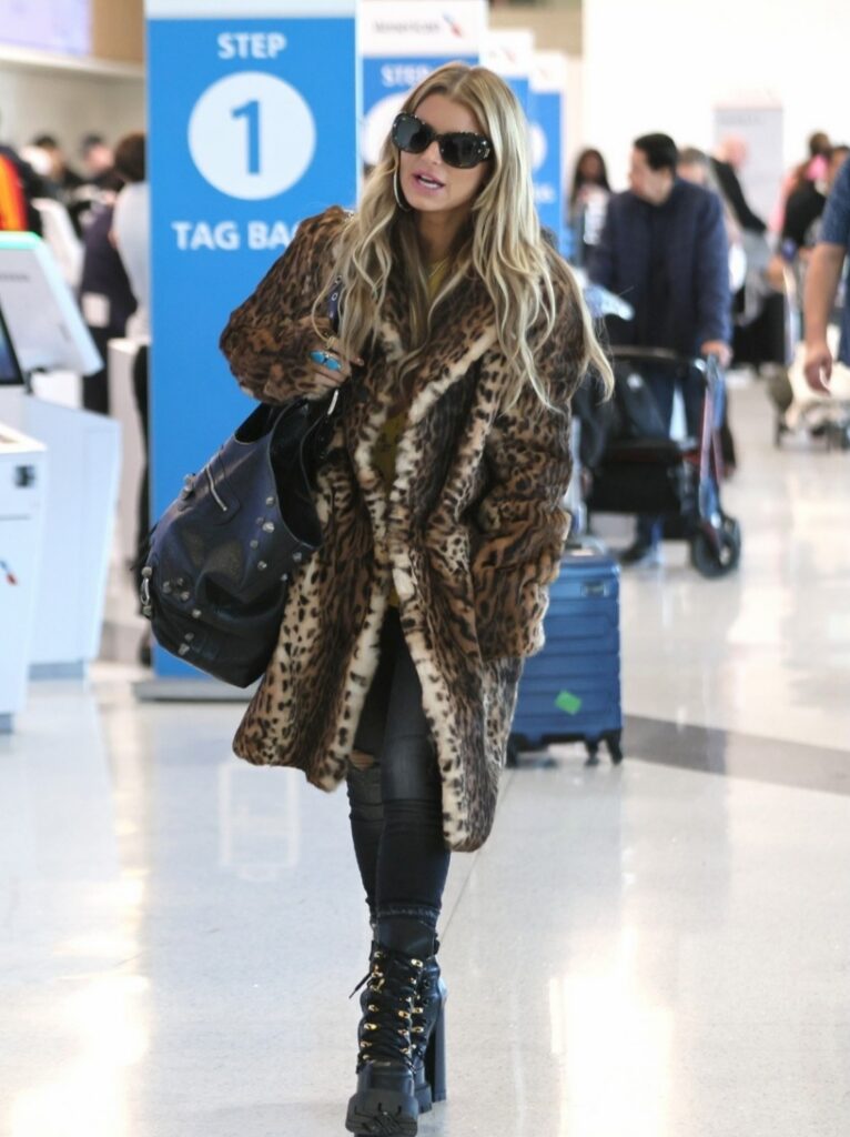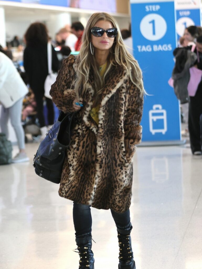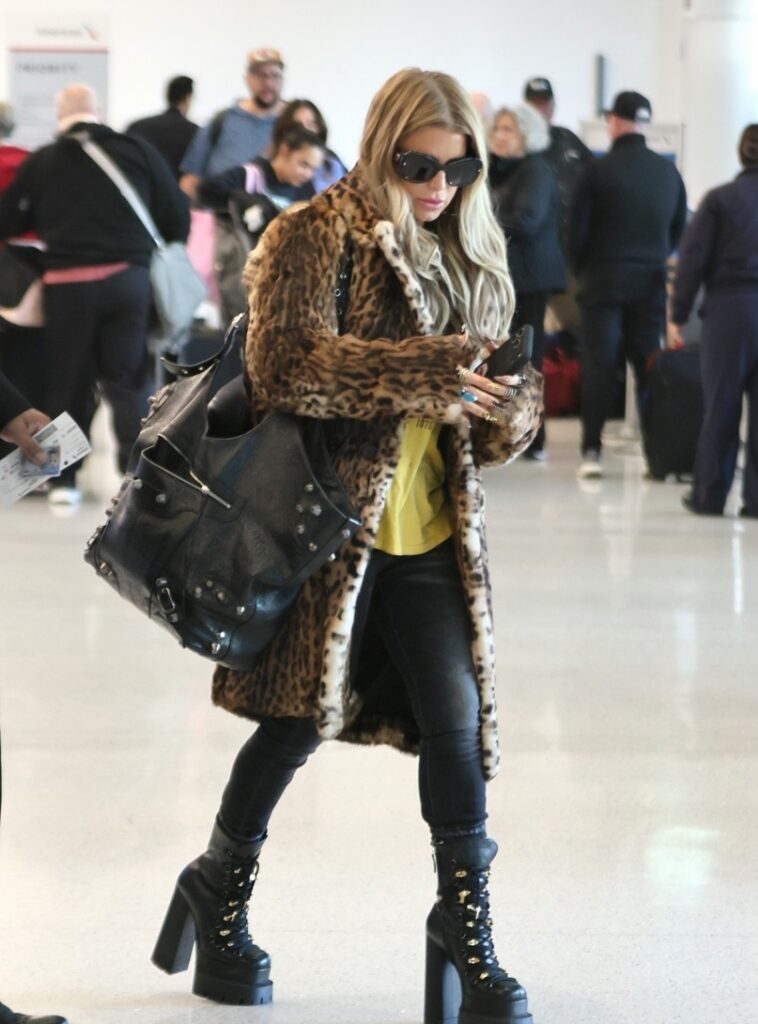 Jessica Simpson arrasa com casaco de estampa de leopardo e calça jeans justíssima em voo saindo de Los Angeles.