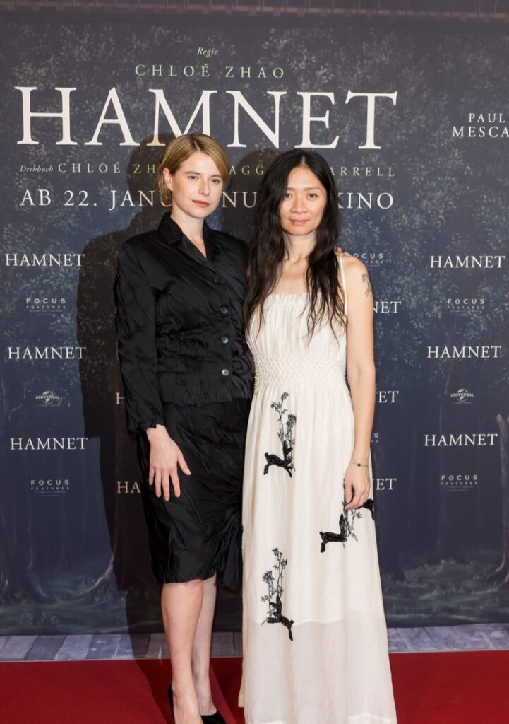 Jessie Buckley e Chloe Zhao comparecem à estreia de ‘Hamnet’ em Berlim após indicações ao Globo de Ouro 2026.