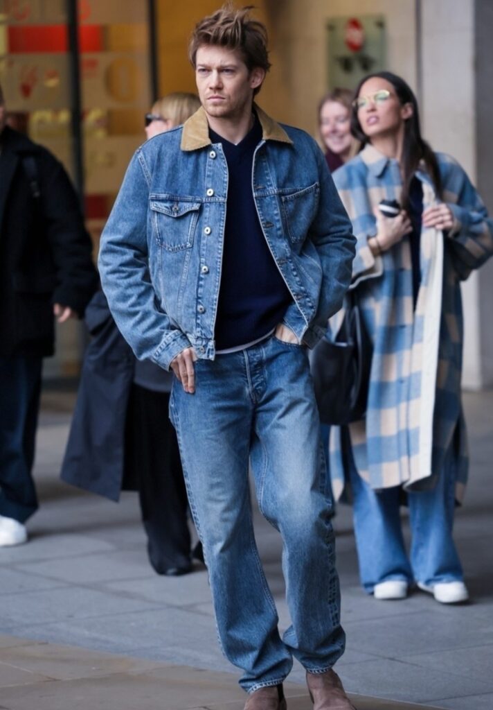 Joe Alwyn exibe look todo jeans durante evento de promoção de ‘Hamnet’ em Londres com a colega de elenco Jessie Buckley.