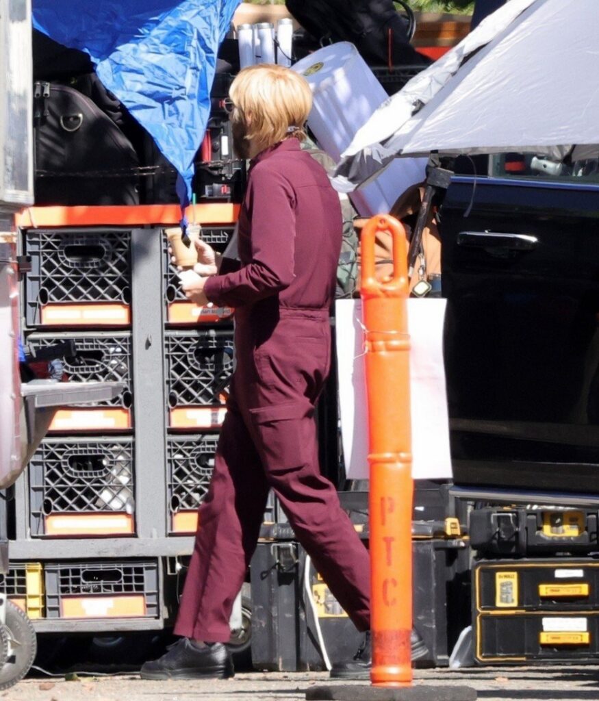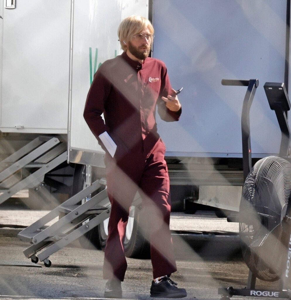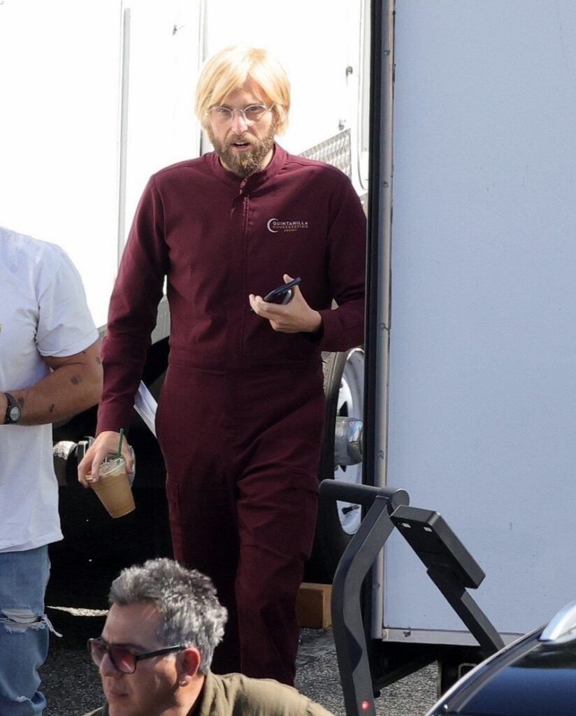 Um Jonah bastante magro foi fotografado andando perto dos trailers usando um uniforme de faxineira marrom com as palavras “Quintanilla Housekeeping Agency” bordadas no peito.