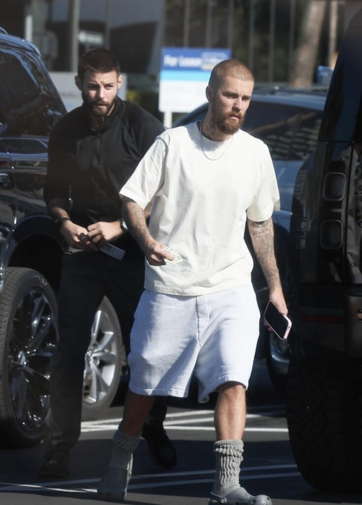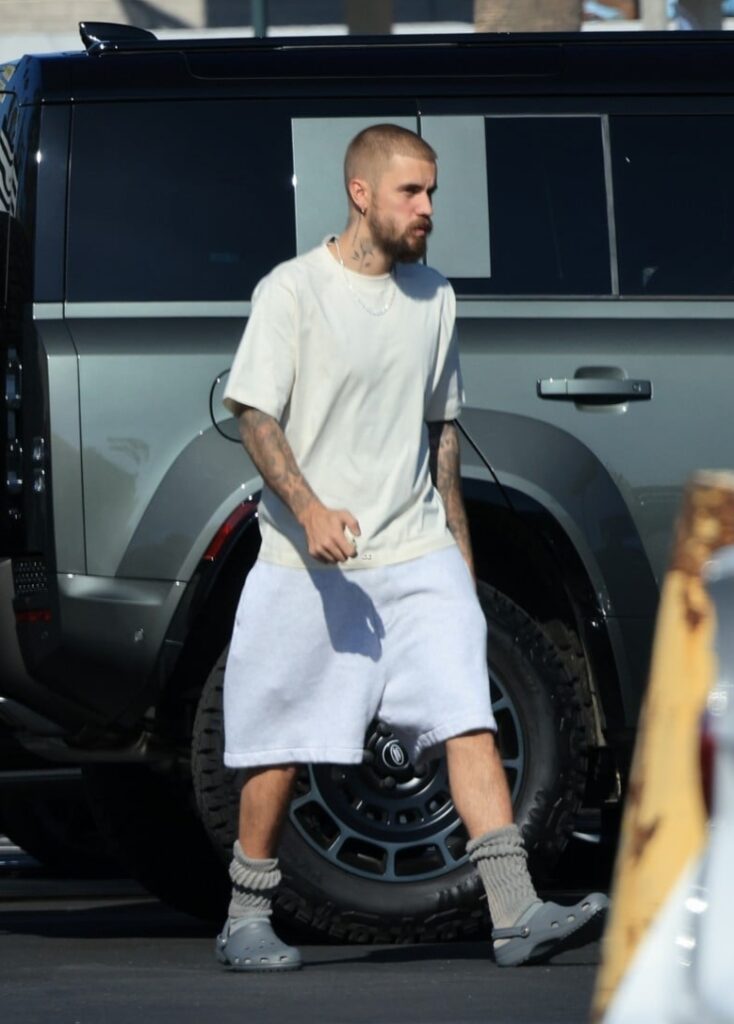 Para o passeio, Justin optou por um visual confortável e casual, vestindo uma camiseta creme e shorts cinza claro, combinados com meias cinzas e Crocs.