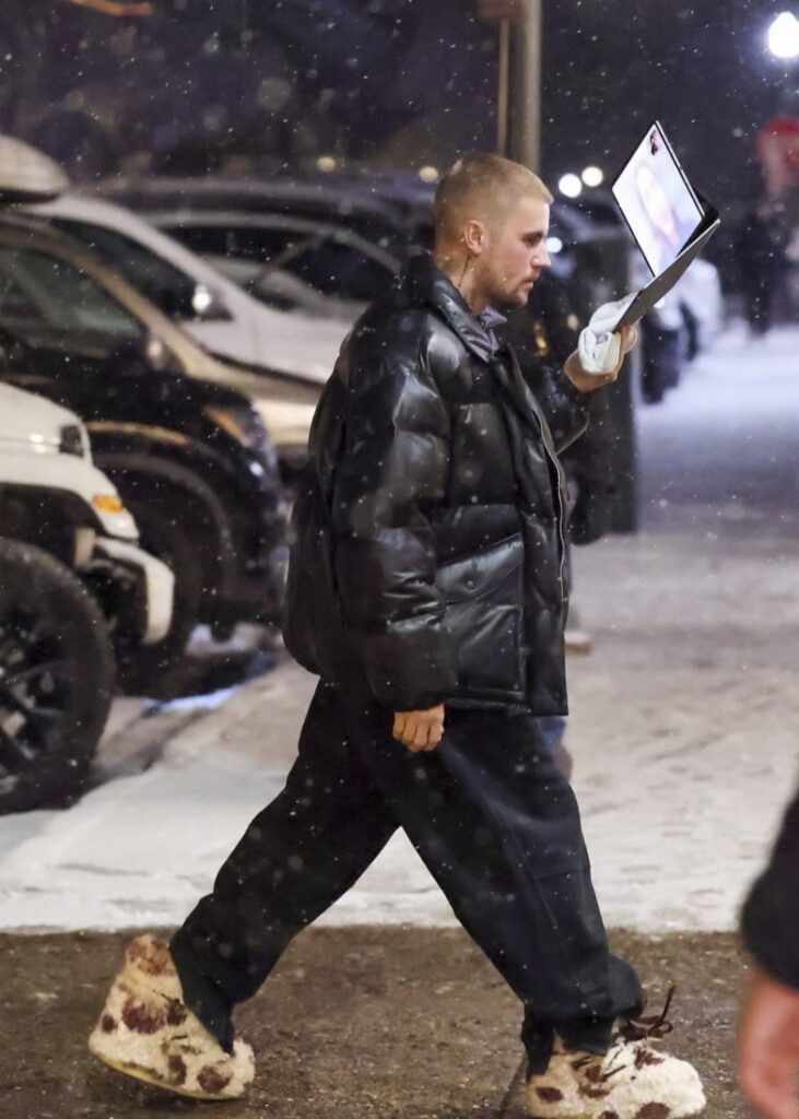 Para o passeio, Justin estava agasalhado com uma jaqueta puffer preta, calça de neve preta e botas felpudas.