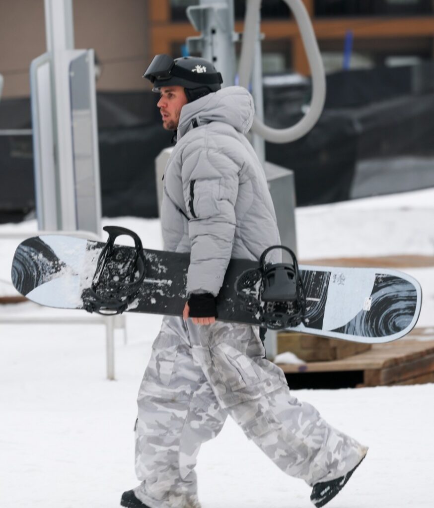 Mais cedo naquele dia, Justin usou uma jaqueta cinza com calça de neve cinza com estampa camuflada enquanto praticava snowboard com os amigos.