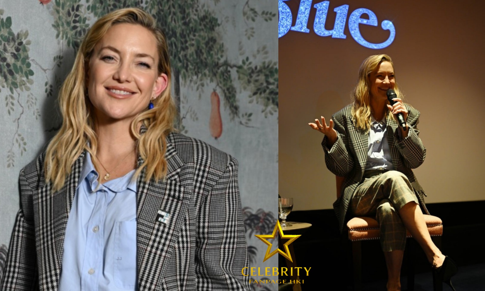 Kate Hudson comparece à exibição de ‘Song Sung Blue’ com um blazer xadrez e calças combinando.