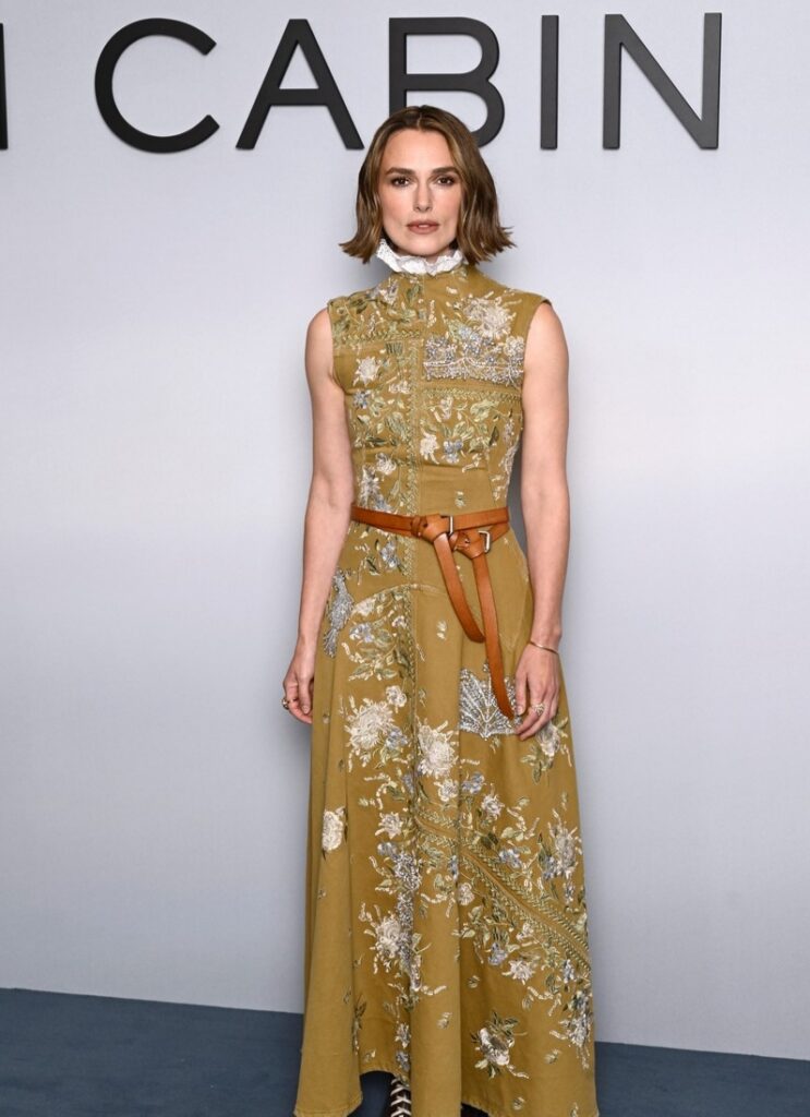 Keira Knightley usa vestido com gola de babados na estreia de “Mulher na Cabine 10” em Londres