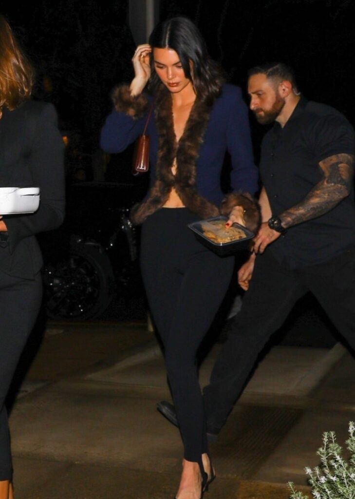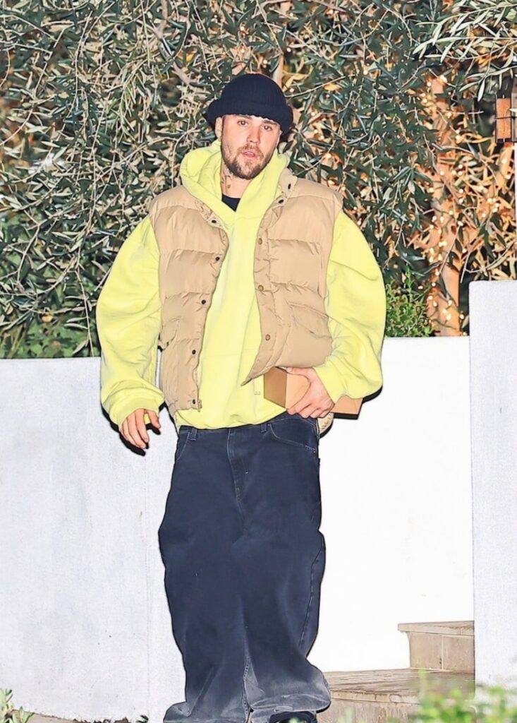 Para a festa, Kendall usou um top azul-marinho com detalhes em pele marrom e calça preta, enquanto Hailey, de 29 anos, vestiu um blazer e saia pretos e Justin, de 31 anos, usou um colete puffer bege, moletom amarelo vibrante e calça jeans preta.