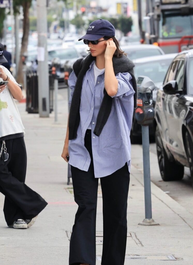 Para o passeio, Kendall exibiu seu estilo de modelo fora do expediente, vestindo uma camisa social listrada azul oversized e calça preta com um suéter preto sobre os ombros, combinado com um boné de beisebol azul-marinho, óculos escuros e chinelos.