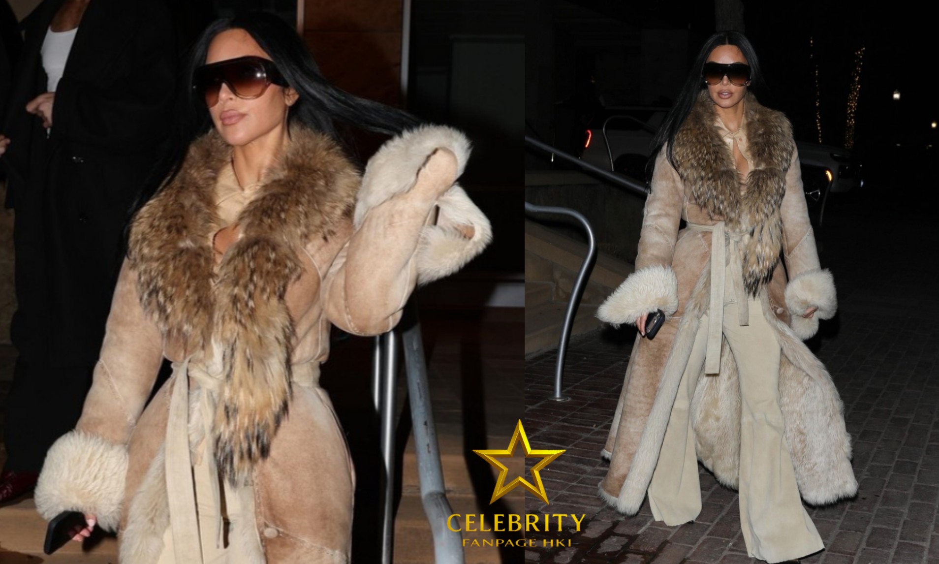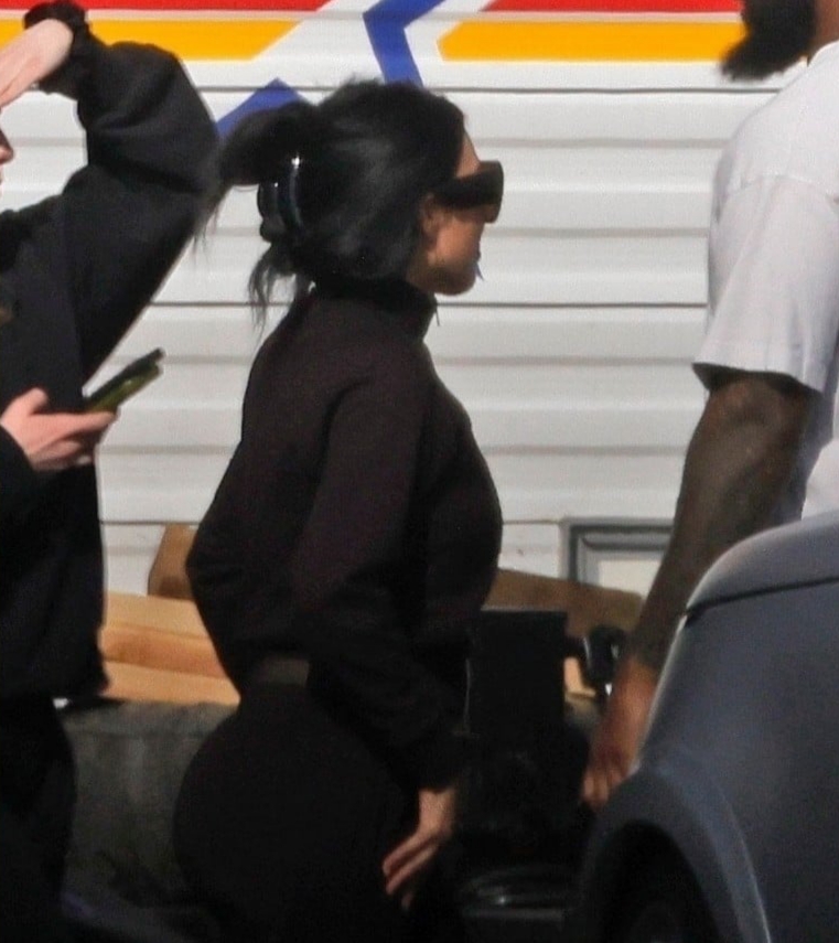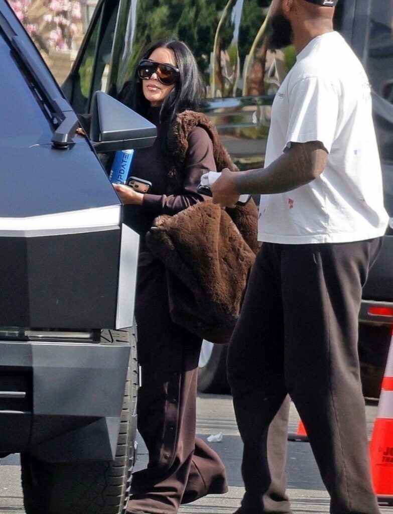 Para o dia de filmagem, a estrela de Kardashian chegou vestindo um look todo marrom, incluindo calça comprida e suéter de mangas compridas. Ela também carregava uma grande bolsa marrom de pele sintética e usava óculos de sol grandes, além de segurar uma bebida energética Update.