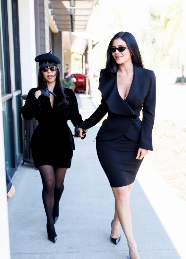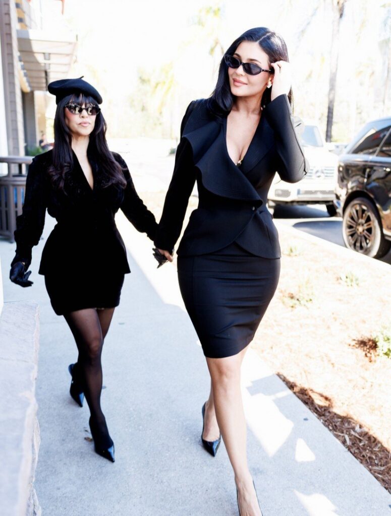Para o evento, Kourtney, de 46 anos, usou um blazer e saia pretos, combinados com uma boina e luvas de couro, enquanto Kylie, de 28 anos, optou por um vestido preto.