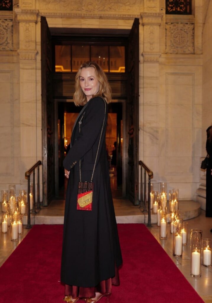 Leighton estava elegante em um vestido de cetim bordô com decote em V profundo e alças finas. Ela complementou o visual com joias minimalistas, incluindo um delicado colar de ouro e sapatos de salto alto abertos na frente.