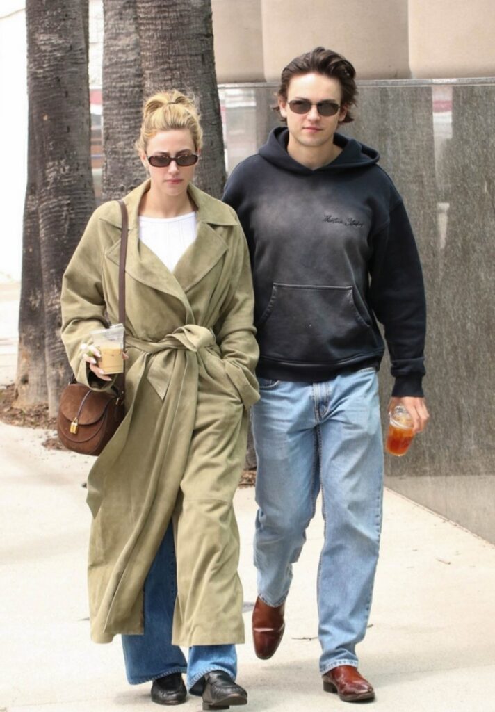 For their outing, Lili wore a green trenchcoat over a white shirt and jeans paired with black loafers, a brown bag, and sunglasses while the 27-year-old La Brea actor sported a black hoodie, jeans, brown shoes, and sunglasses.