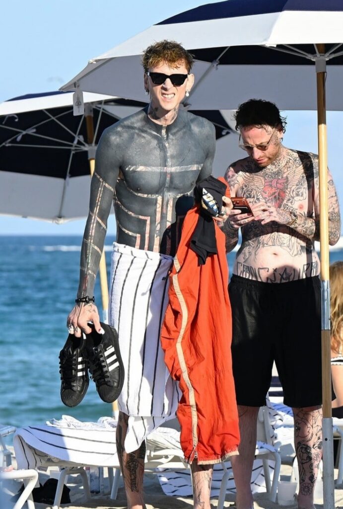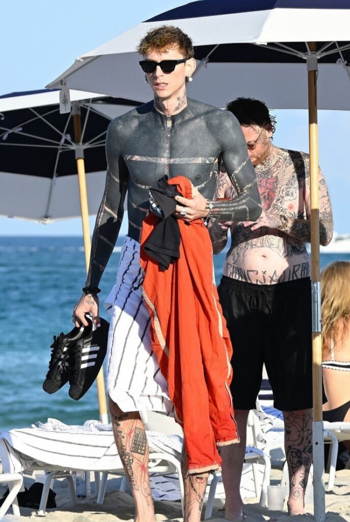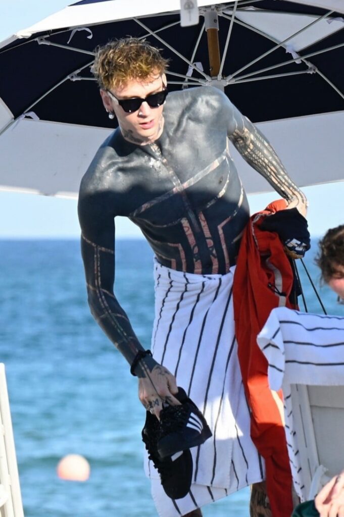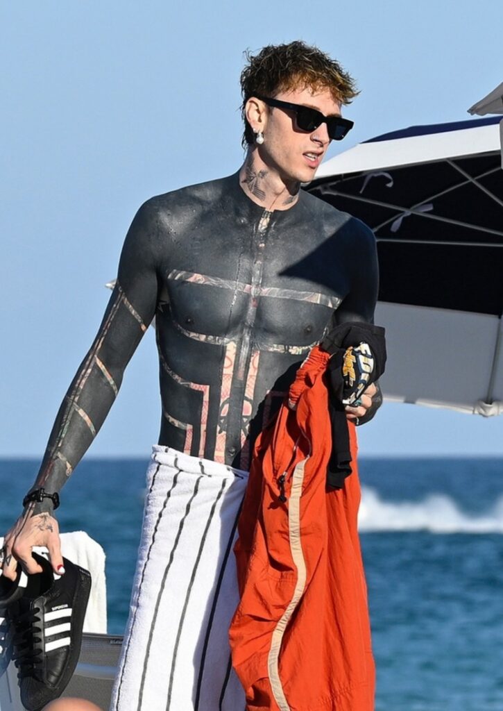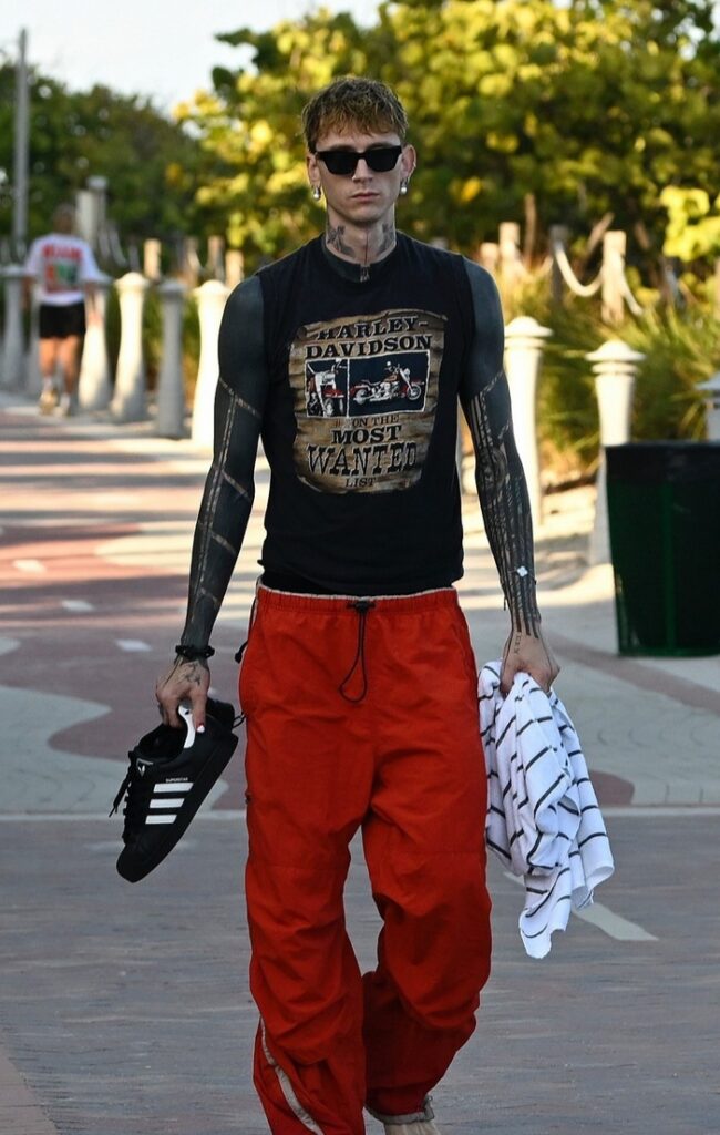 Na praia, MGK exibiu suas tatuagens pretas e manteve uma toalha enrolada na cintura. Quando estava pronto para ir embora, pegou seus sapatos e a toalha e vestiu uma calça laranja e uma camiseta regata da Harley Davidson.