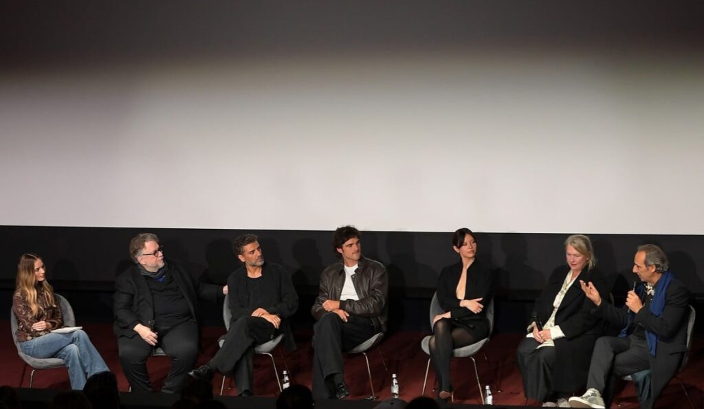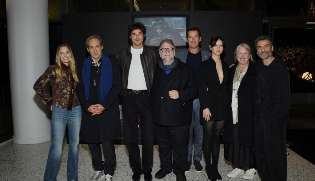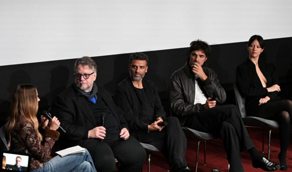 Os colegas de elenco Oscar Isaac e Mia Goth também estiveram presentes, assim como o diretor, roteirista e produtor Guillermo del Toro.
