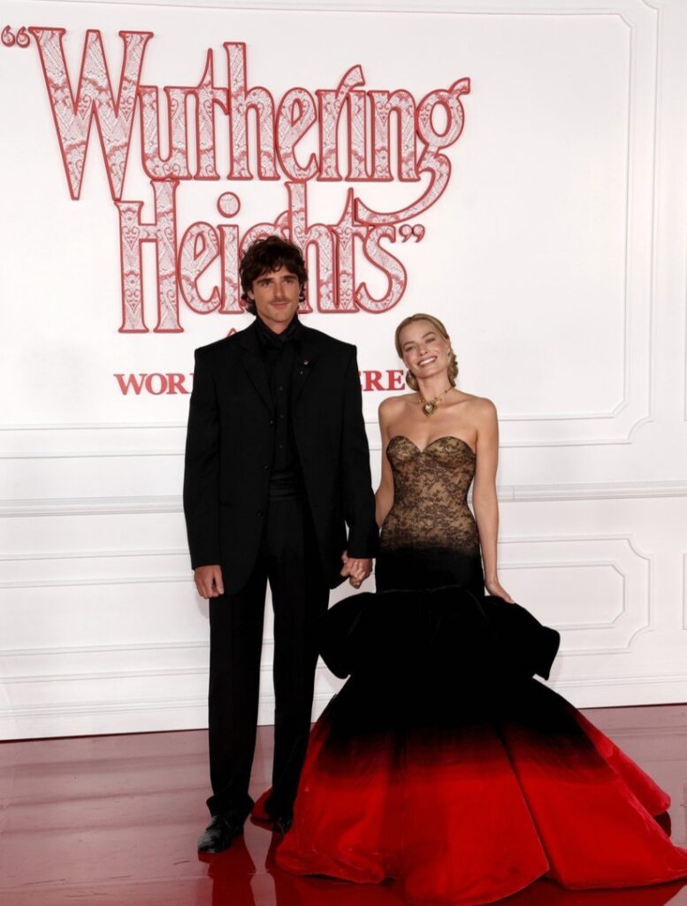 Margot Robbie deslumbra em vestido ombré em camadas na estreia mundial de ‘O Morro dos Ventos Uivantes’ com Jacob Elordi