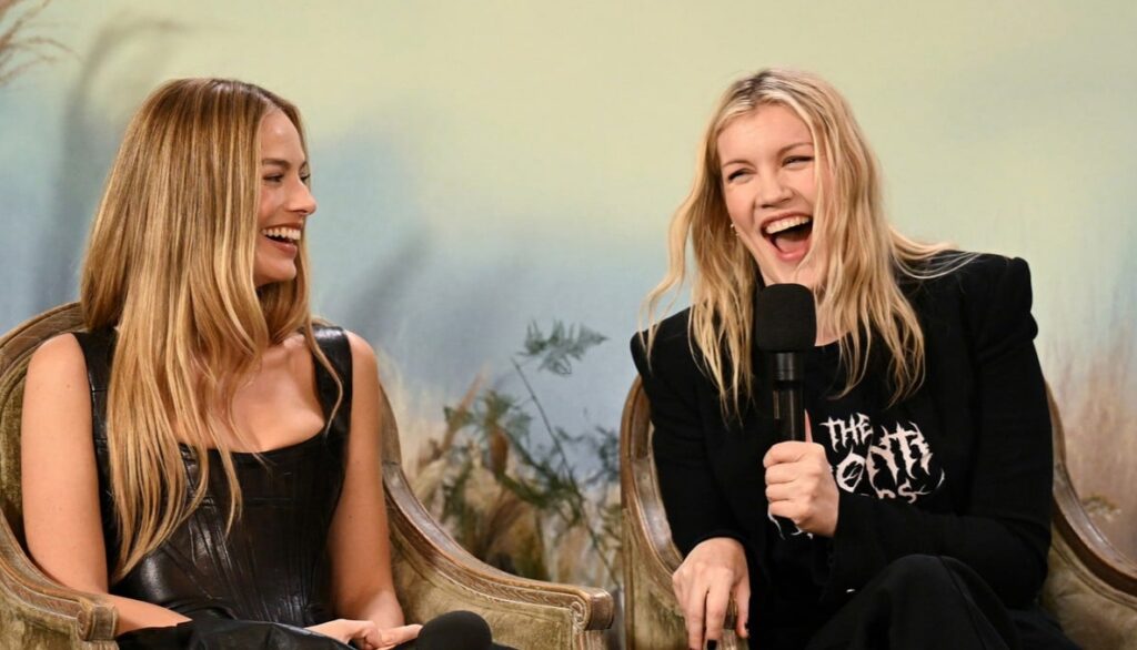 Margot Robbie usa espartilho de couro e minissaia na imprensa de ‘O Morro dos Ventos Uivantes’