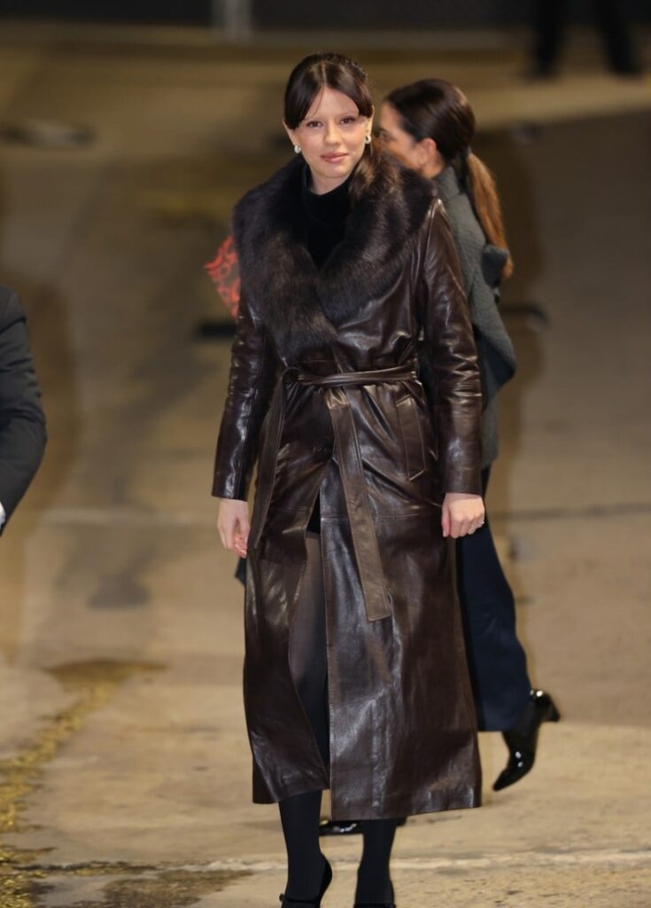 Ela usava um sobretudo forrado de pele com sapatos de salto pretos e, para o programa em si, vestia um elegante vestido preto da Patou, com meia-calça Wolford e sapatos Mary Jane da Manolo Blahnik.