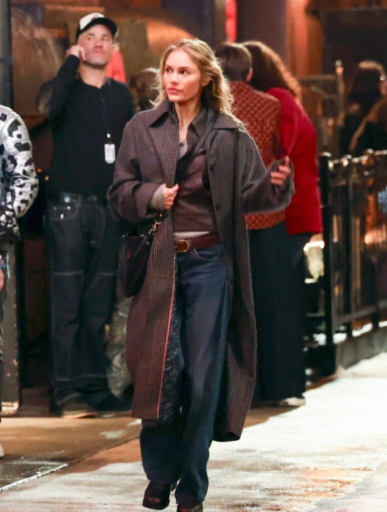 She was wearing a long patterned trench coat with a gray top, jeans, black boots, and a belt.