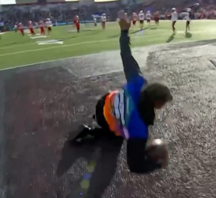 O artista de 54 anos estava na lateral do campo durante a partida entre Fresno State Bulldogs e Miami RedHawks, em Tucson, e não resistiu a participar da ação.