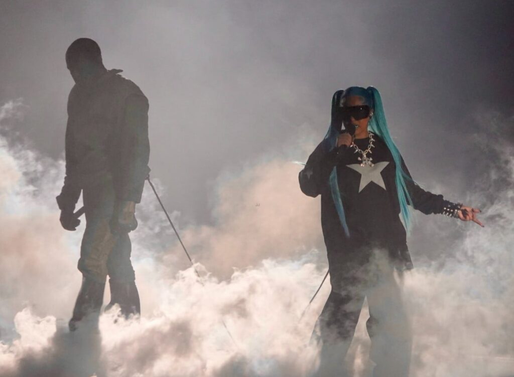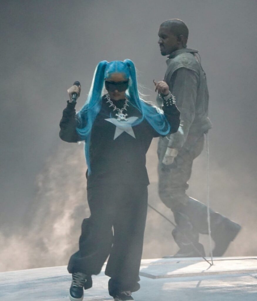 North was seen sporting long blue hair, oversized sunglasses, and a black sweatshirt with a white star on it as she and her dad performed “Talking,” Kanye‘s 2024 track which she is featured on.