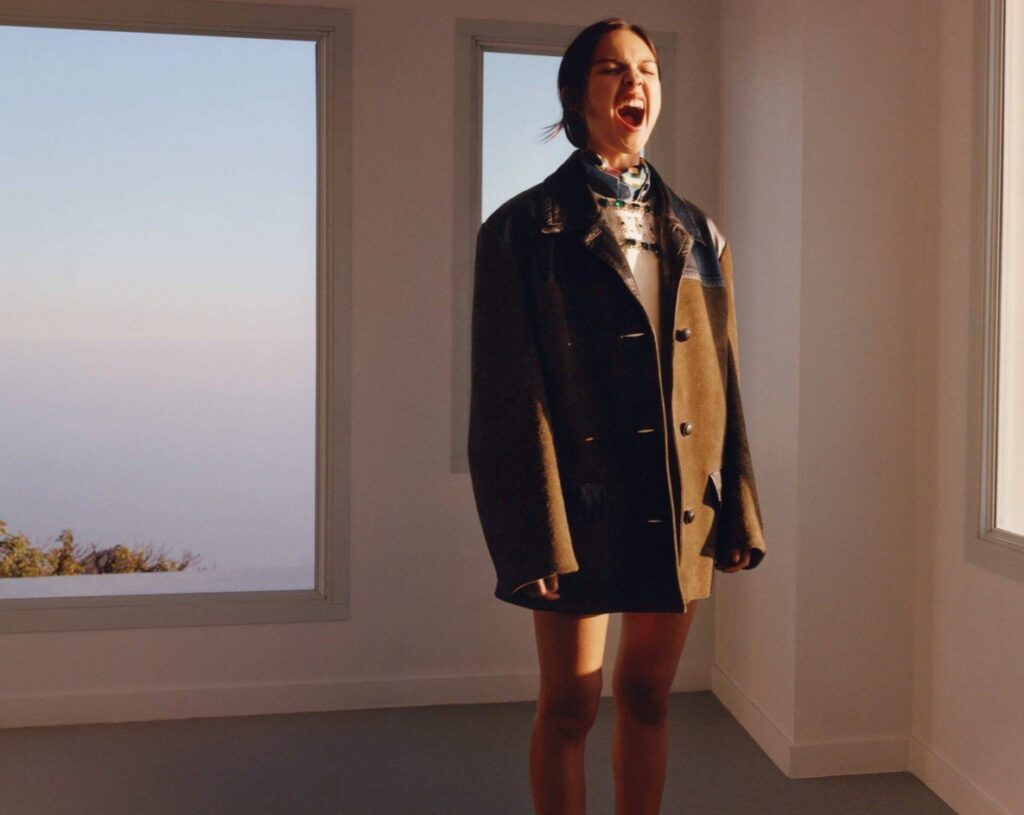 A cantora de 22 anos fez parte da campanha Primavera/Verão 2026 intitulada “On Cloud Nine”. O guarda-roupa é descrito como “inspirador, ao mesmo tempo industrial e ultrafeminino, forte e doce”.