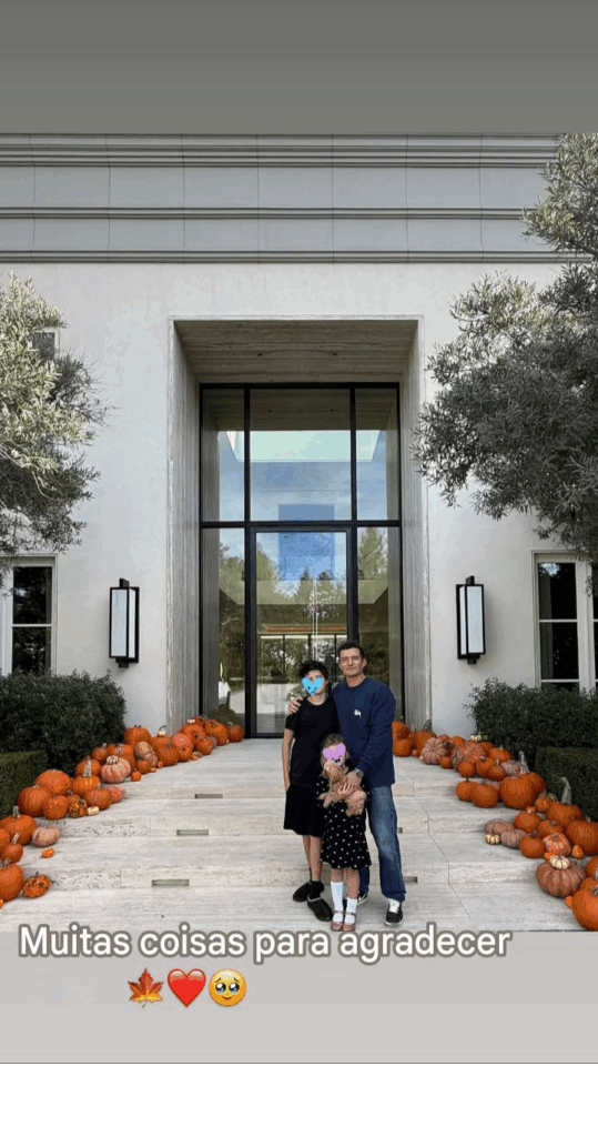 “Tenho muito a agradecer”, escreveu Orlando enquanto posava com os dois filhos em frente a uma casa com uma escadaria repleta de abóboras.