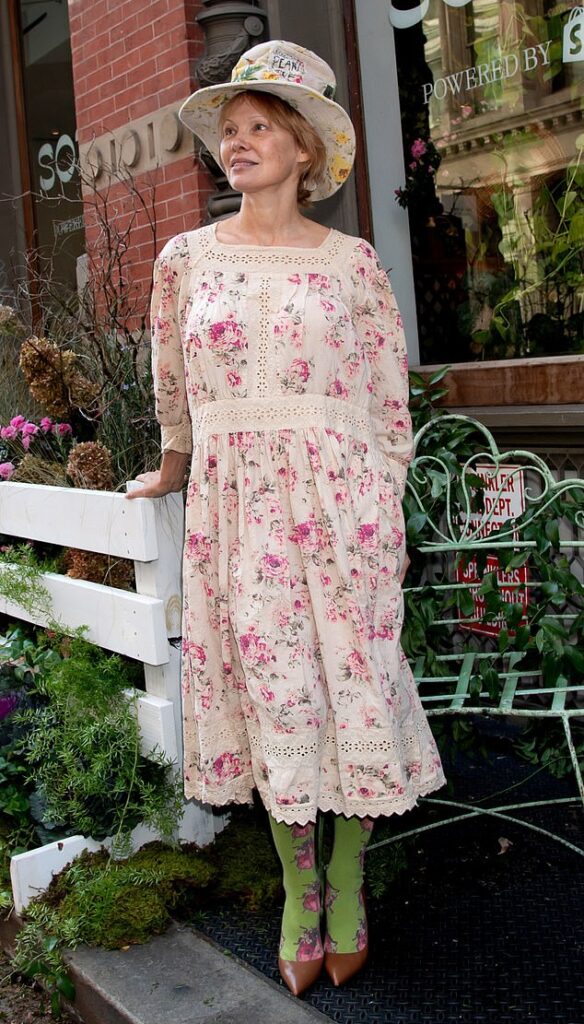A atriz de 58 anos — que participou da Semana de Moda de Paris no início deste mês — vestiu um vestido sem forma definida da Magnolia Pearl, modelo Donby Cupid Rose, no valor de US$ 550, escondendo sua famosa silhueta.