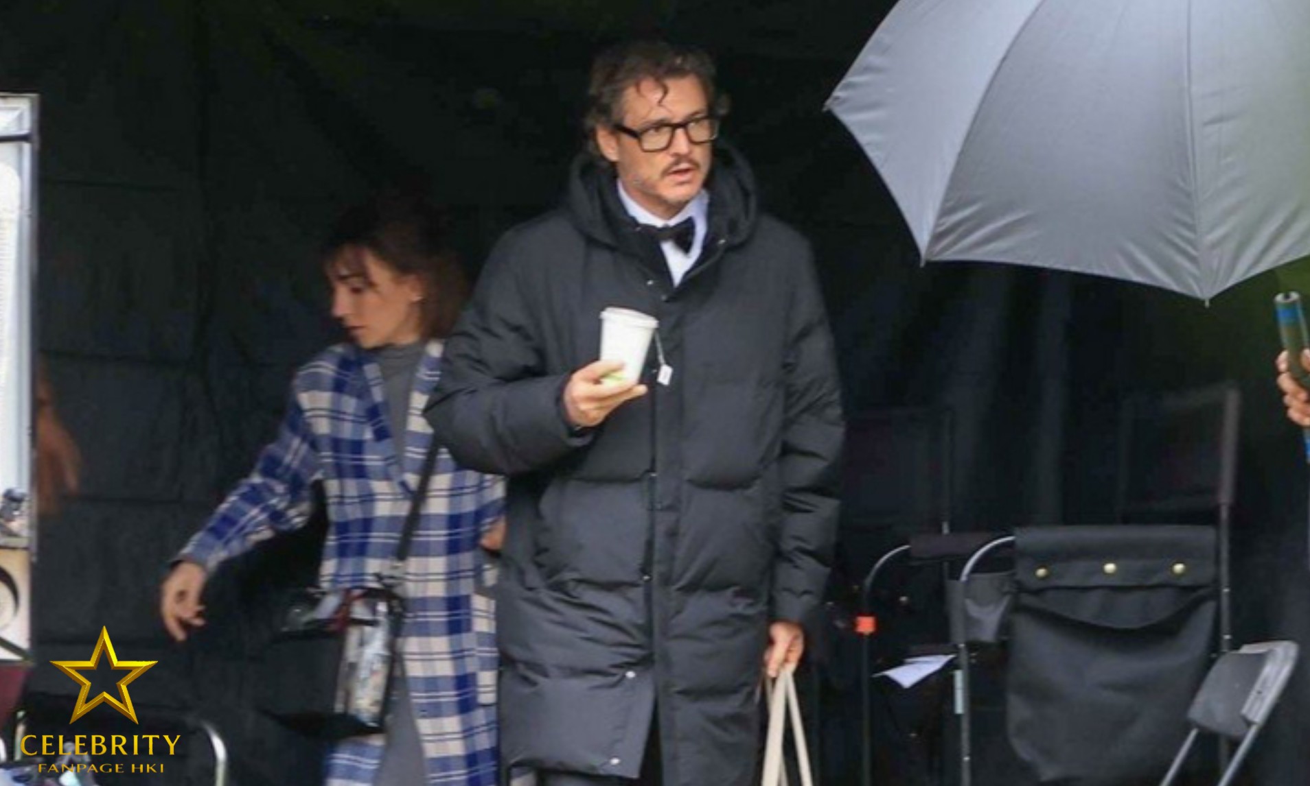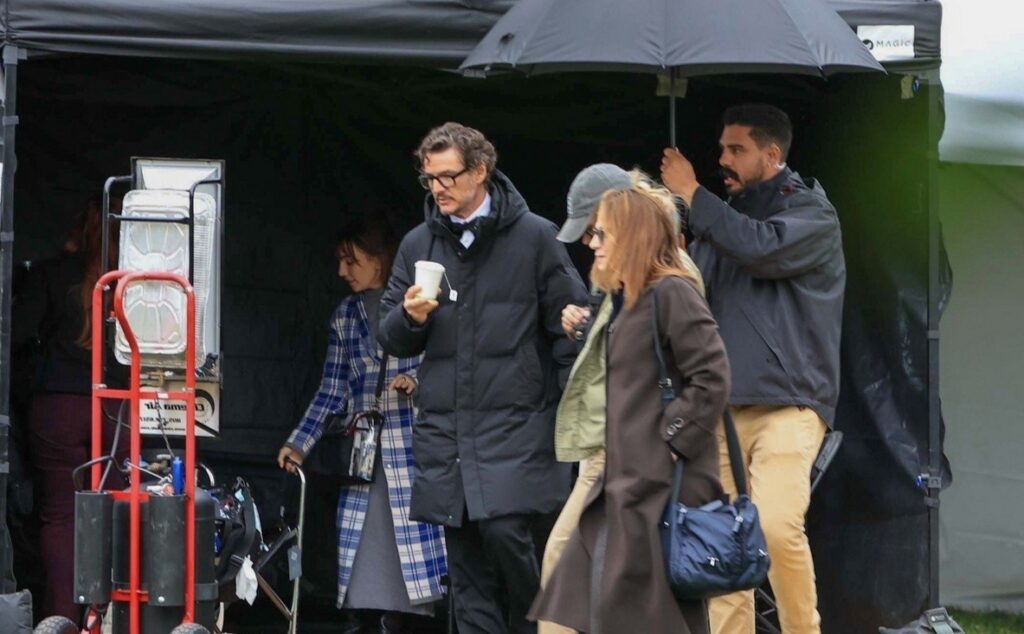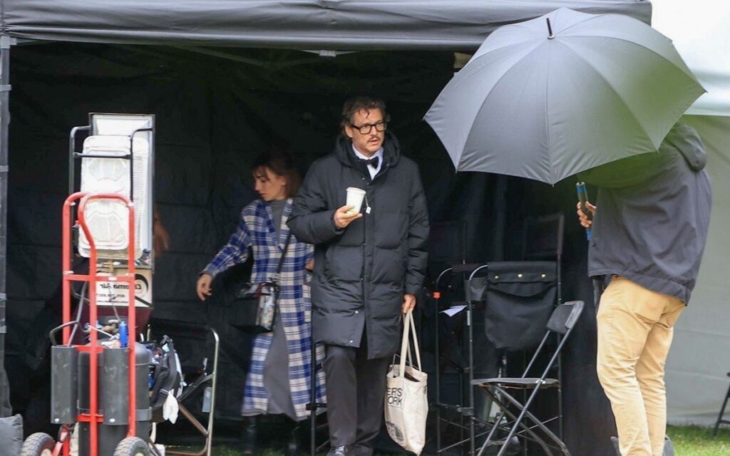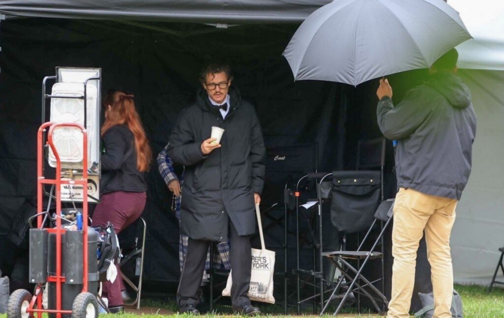 Pedro estava agasalhado com um longo casaco preto acolchoado, usado sobre seu figurino mais formal. Parecia estar frio e garoando no set, e o ator foi visto aquecendo as mãos com uma xícara de chá dentro da tenda de produção.